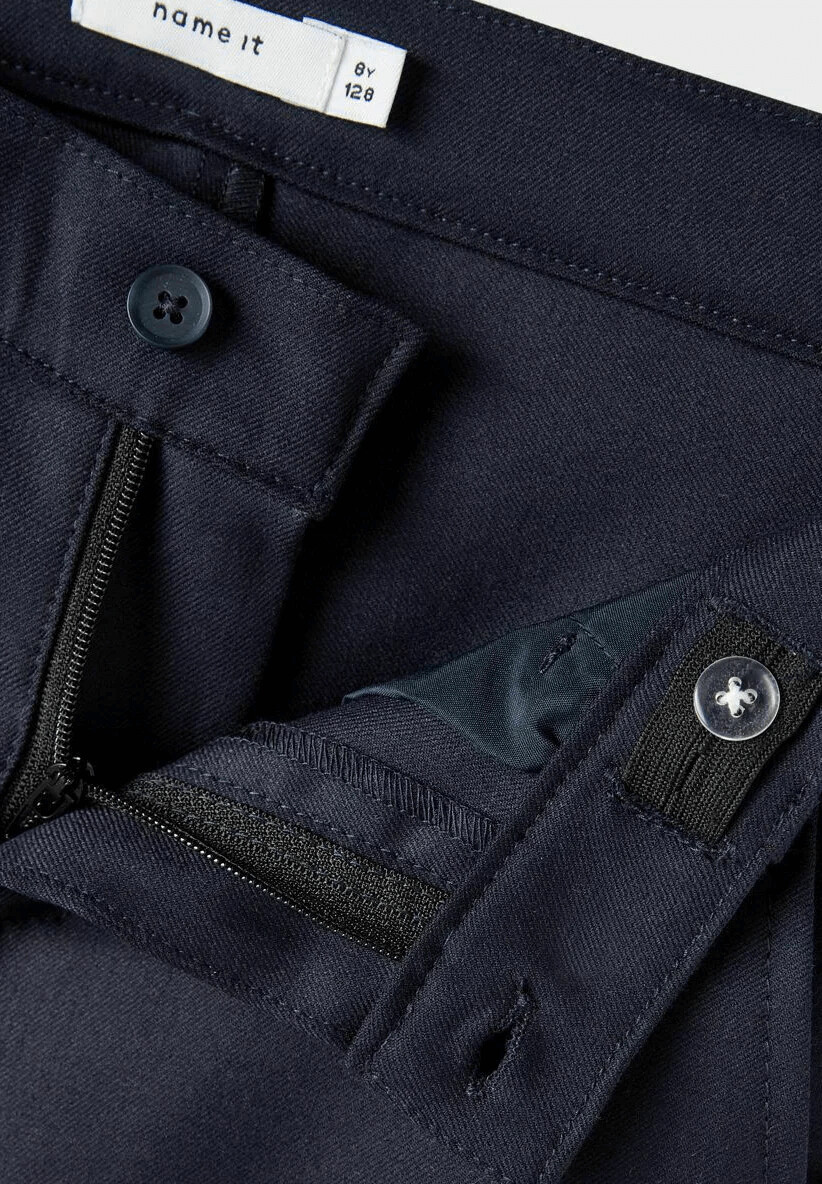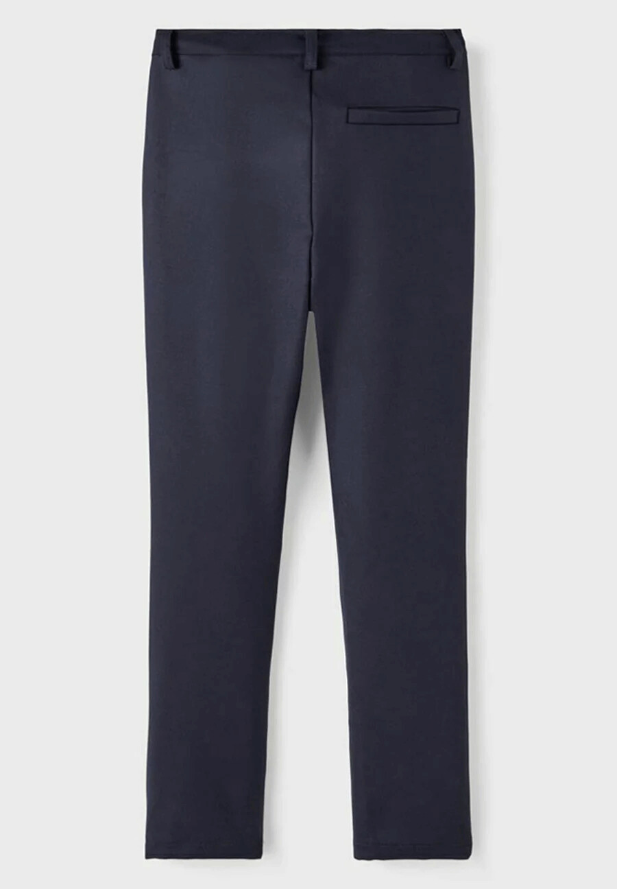 Детские брюки темно-синего цвета на обычной посадке от Name it имеет невидимую молнию, прямой крой и длину по щиколотку.