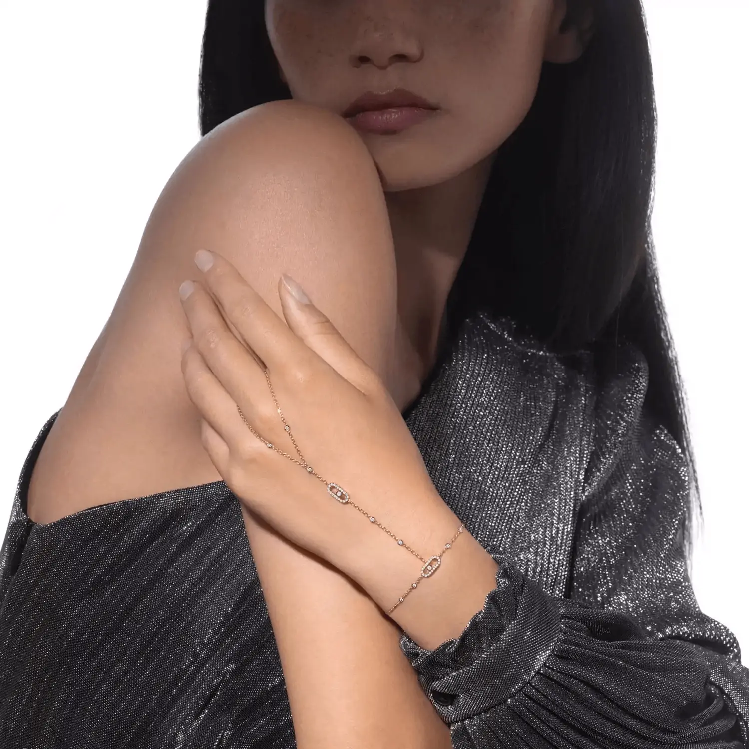 Изящное и оригинальное изделие, браслет на руку Move Uno — идеальное решение для тех, кто не может выбрать между кольцом и бриллиантовым браслетом. Благодаря тонкой цепочке и мотивам Move Uno это роскошное ювелирное изделие с уникальным стилем осветит каждое ваше движение, придав каждому из них изящную чувственность. Изготовленный вручную из 18-каратного розового золота, этот браслет для женщин идеально подходит для всех оттенков кожи.