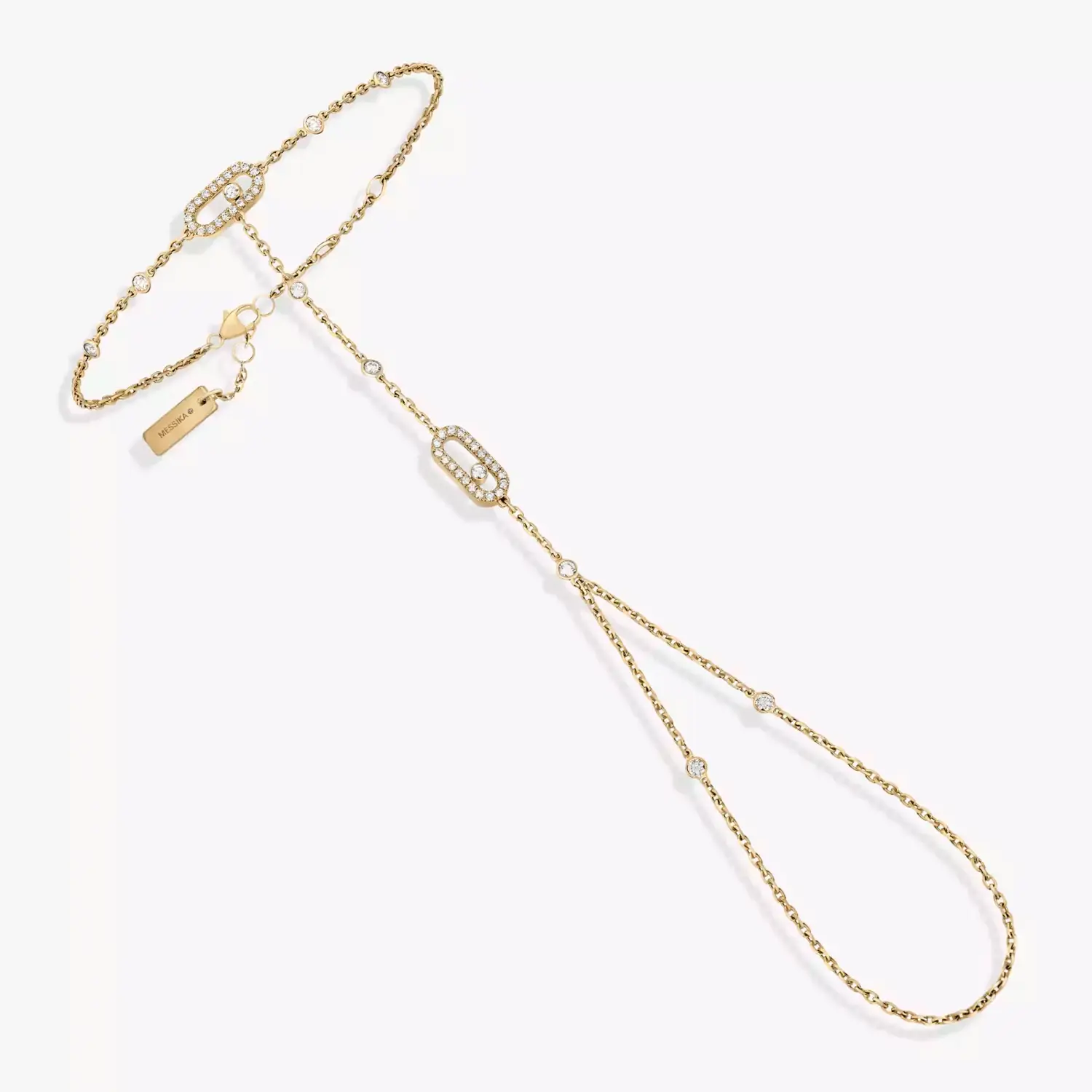 Трудно не влюбиться в этот ультрамодный браслет Move Uno с бриллиантами из желтого золота! Тонкая и нежная, его цепочка одевает вашу руку сияющими, сверкающими бриллиантами, а два мотива Move Uno заставляют бриллианты танцевать на вашей руке при каждом движении. Оригинальное, современное и очень чувственное украшение для женщин.