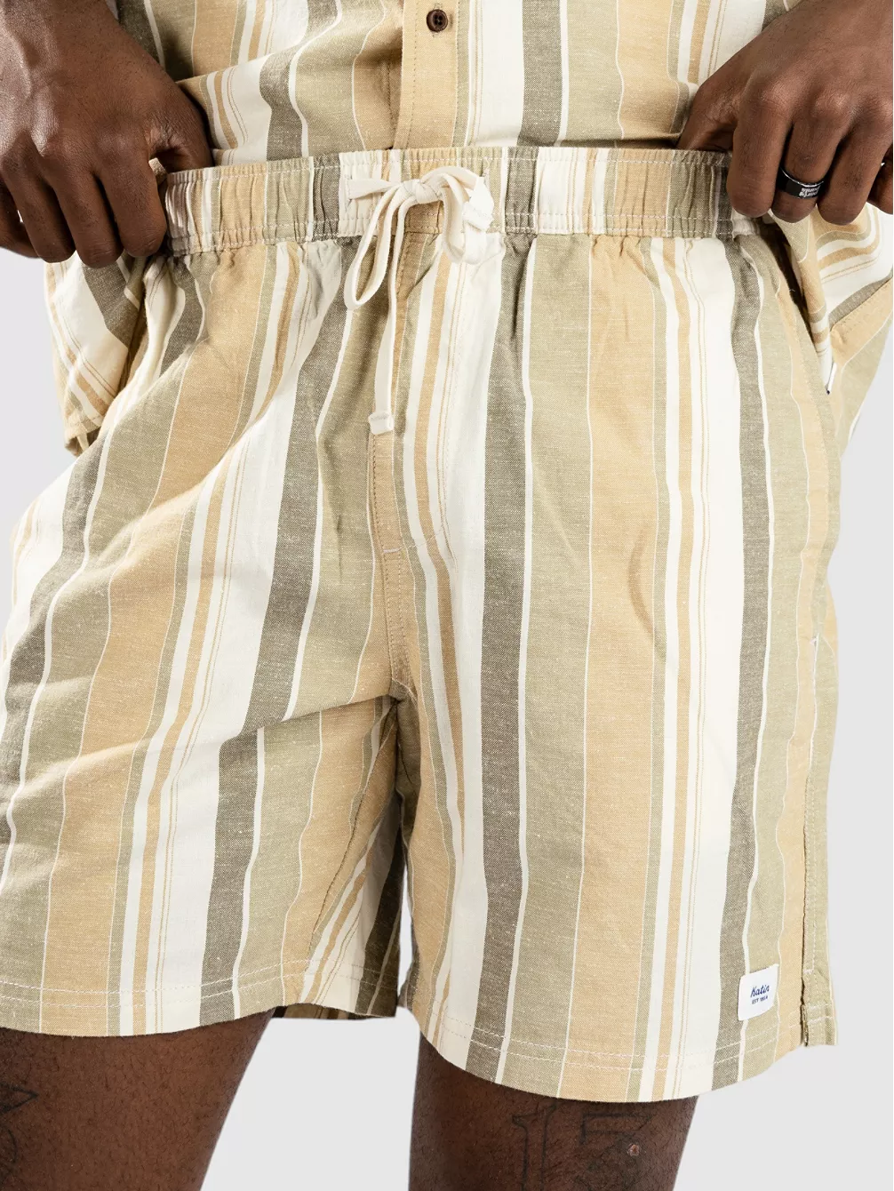 Очень удобные шорты Katin из смесового льна. . Шорты York Local сочетают в себе шик и спортивный стиль. С боковыми карманами, эластичным поясом на шнурке. Все это завершается минималистичным логотипом на левой штанине и тонким полосатым узором.