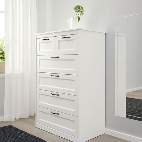 Классический дизайн с панелями на фронтальных панелях выдвижных ящиков никогда не выходит из моды. Ваш дом должен быть абсолютно безопасен для всей семьи. Именно поэтому крепеж безопасности для фиксации комода к стене прилагается. Чтобы ящики не выпадали при открывании, они оснащены специальным стопором.