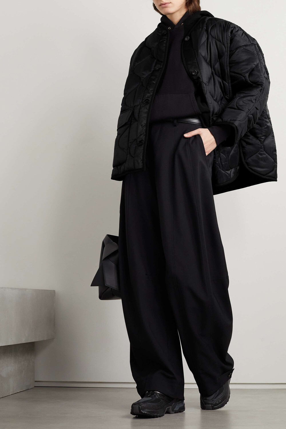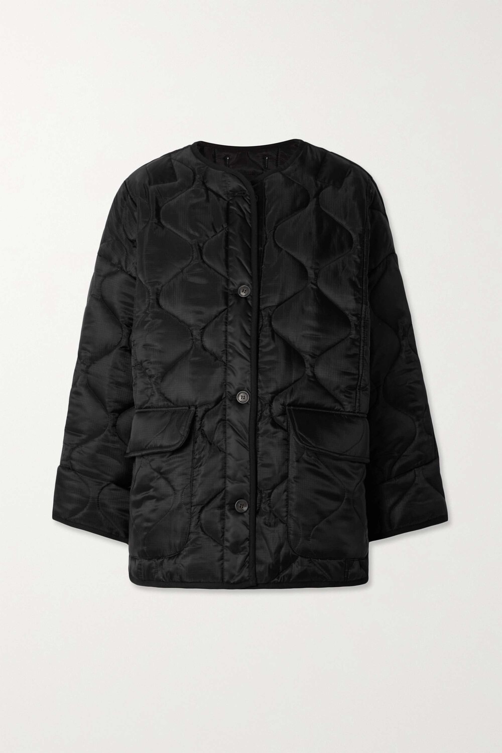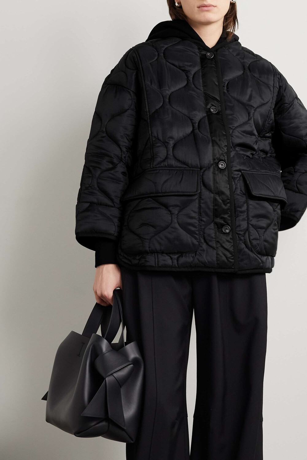 Куртка Frankie Shop имеет вырез без воротника, что дает вам больше места, чтобы надеть под нее массивную водолазку. Он сделан из черного рипстопа с утепленной подкладкой и имеет вместительный силуэт с большими карманами с клапанами.