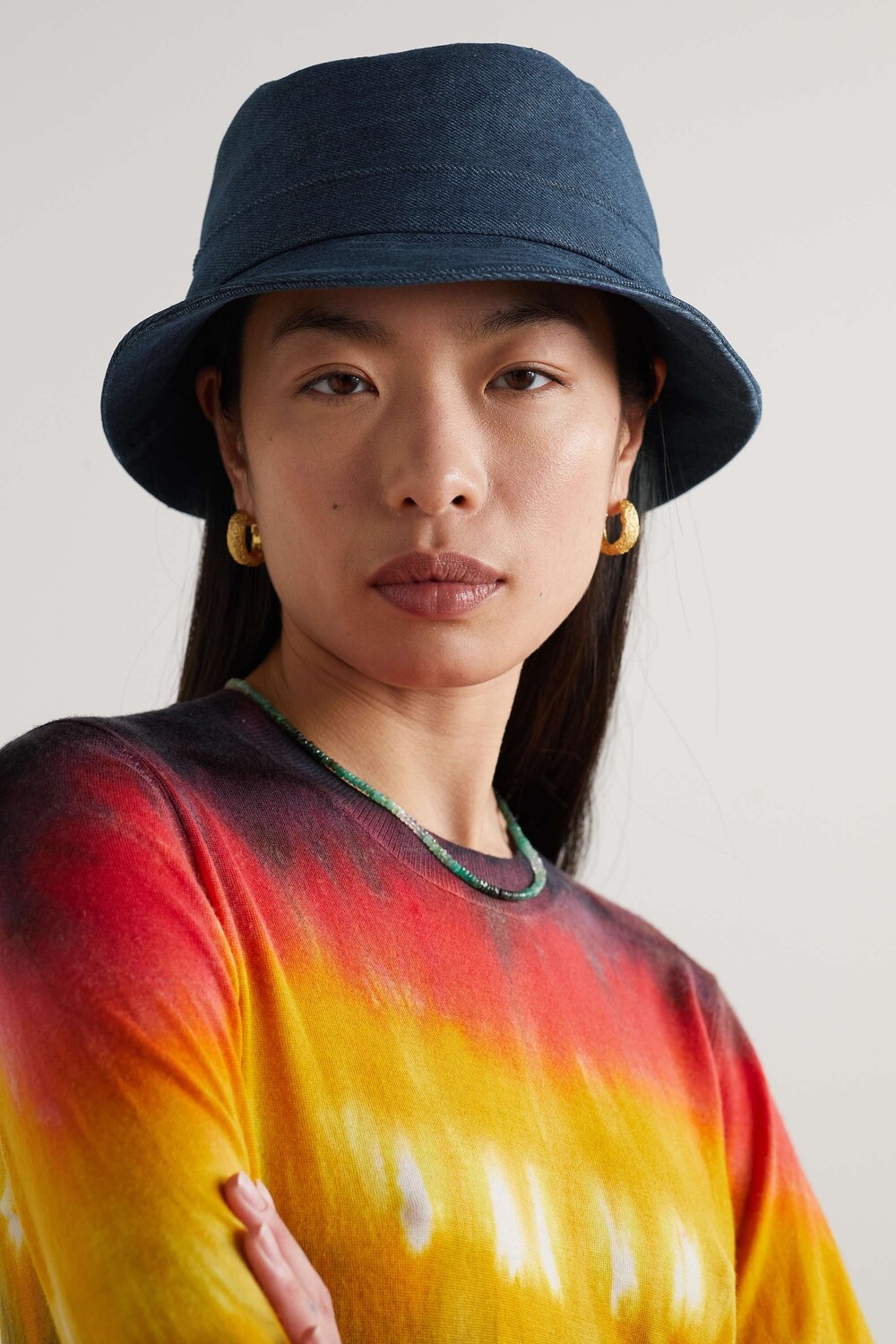 Шляпа-ведро Габриэлы Херст имеет преувеличенные поля и широкую ленту, напоминающую традиционную фетровую шляпу. Модель выполнена из джинсовой ткани, что придает ей мягкую и неструктурированную форму, а отстрочка в тон придает изысканный вид.