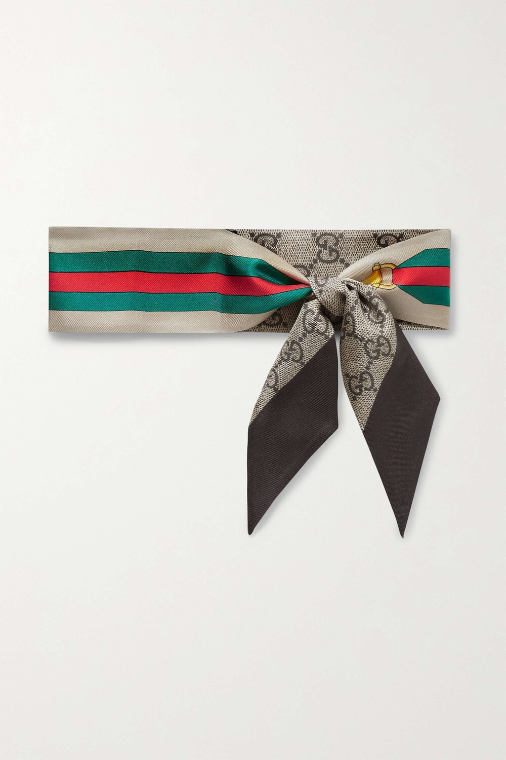 Шарф Gucci сделан из шелковой саржи с разными узорами на каждой стороне — вы можете носить его либо с культовой монограммой «GG», либо с фирменными красными и зелеными полосами и мотивом в виде лошадиных укусов. Привяжите его к любимой сумке или носите как повязку на голову.