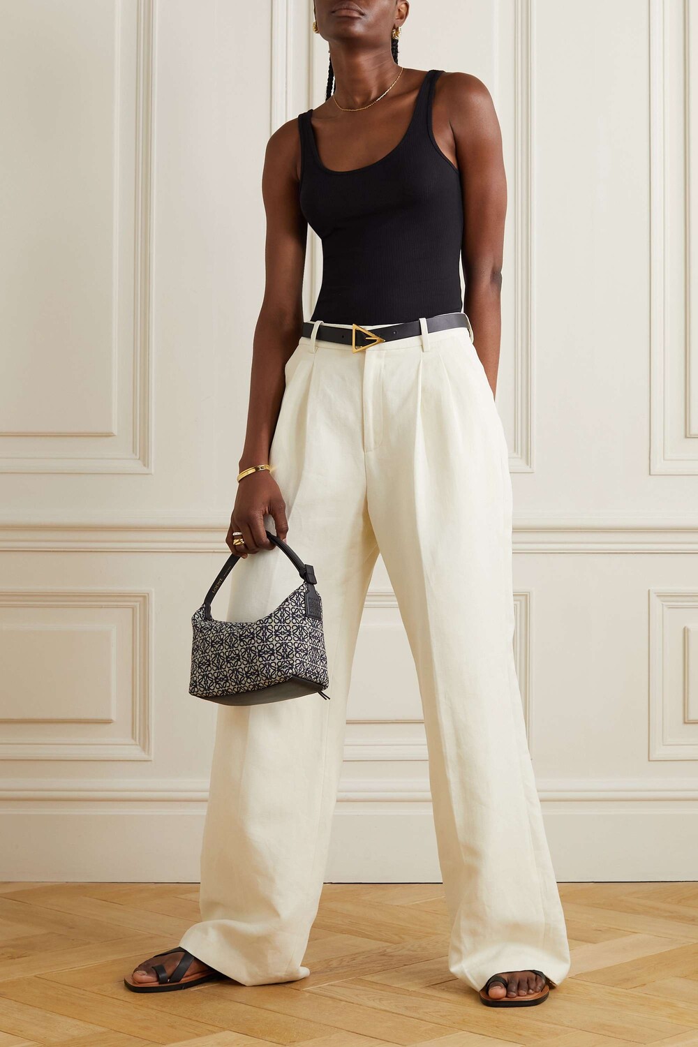 Для создания этой очень удобной майки Джеймс Перс выбрал ребристый хлопок Supima из-за его мягкости и прочности. Эта черная модель с легким натяжением обеспечивает наилучшую посадку и идеально сочетается с другими предметами. Здесь представлены: брюки T by Alexander Wang, сумка на плечо Alexander Wang, сандалии ATP Atelier, серьги Sophie Buhai.