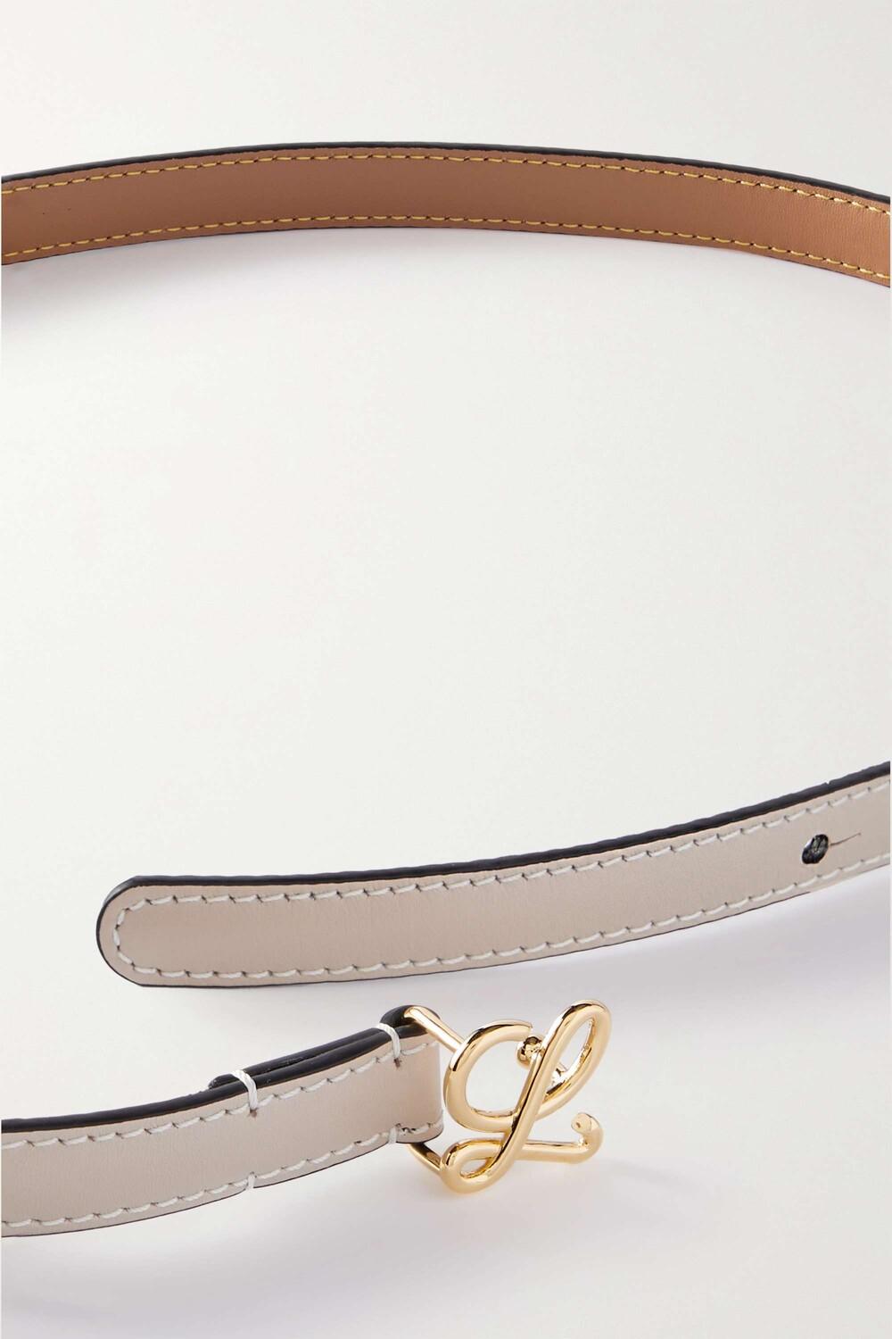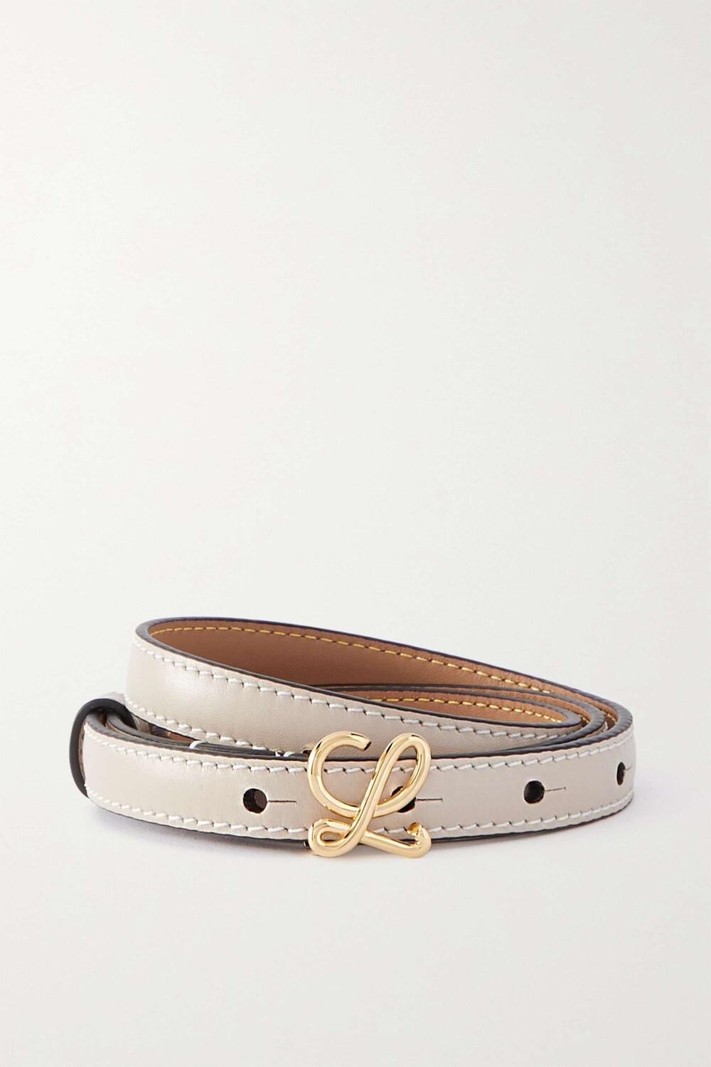 Ремень Loewe изготовлен в Испании из мягкой кожи светло-грибного цвета и имеет тонкий силуэт, обведенный белой строчкой. Он дополнен изящной золотистой пряжкой, выполненной в форме прописного логотипа «L» на этикетке. Проденьте его через петли ваших любимых джинсов или вокруг талии свободного блейзера.