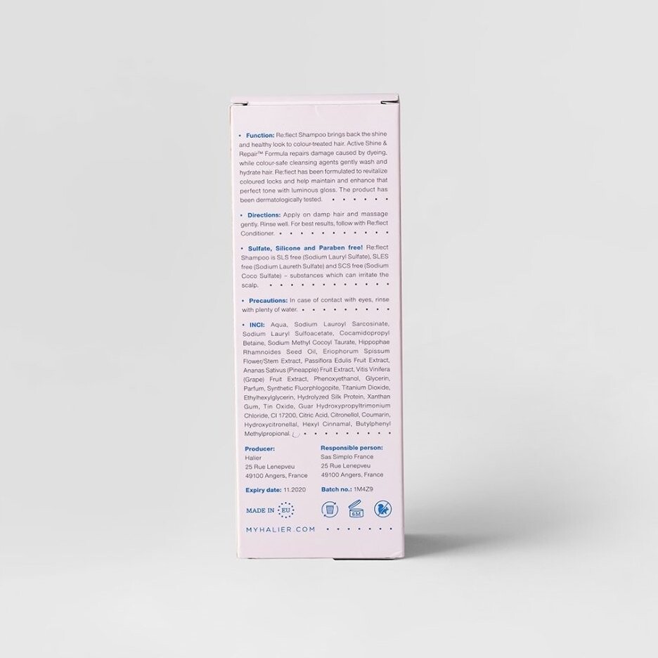 Шампунь Re:flect от Halier дополнительно предотвращает появление статического электричества, облегчает расчесывание, помогает надолго сохранить цвет и блеск волос.