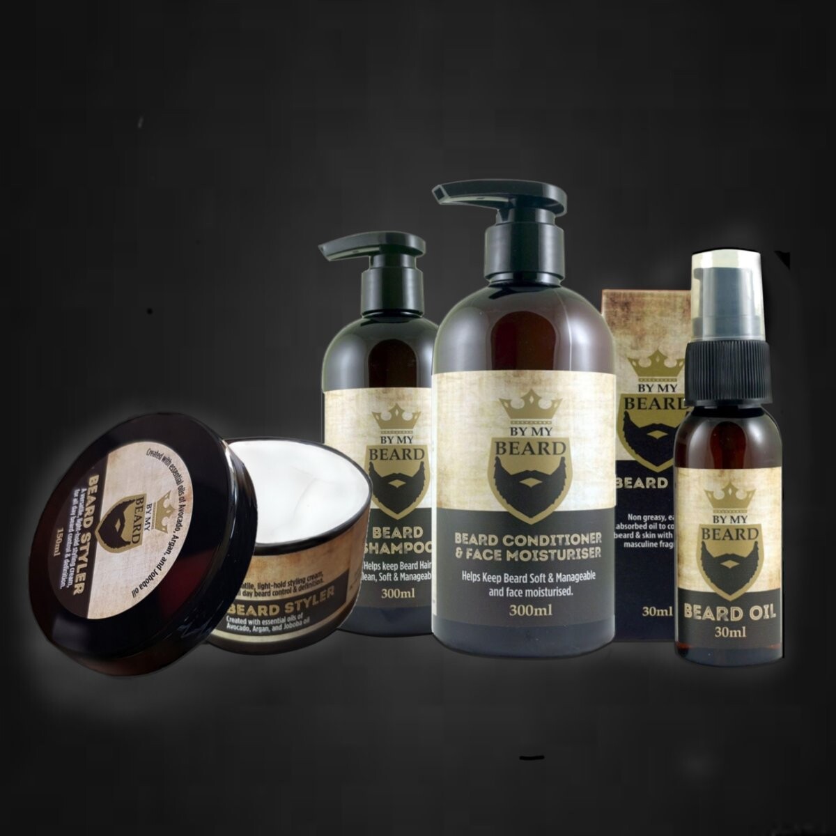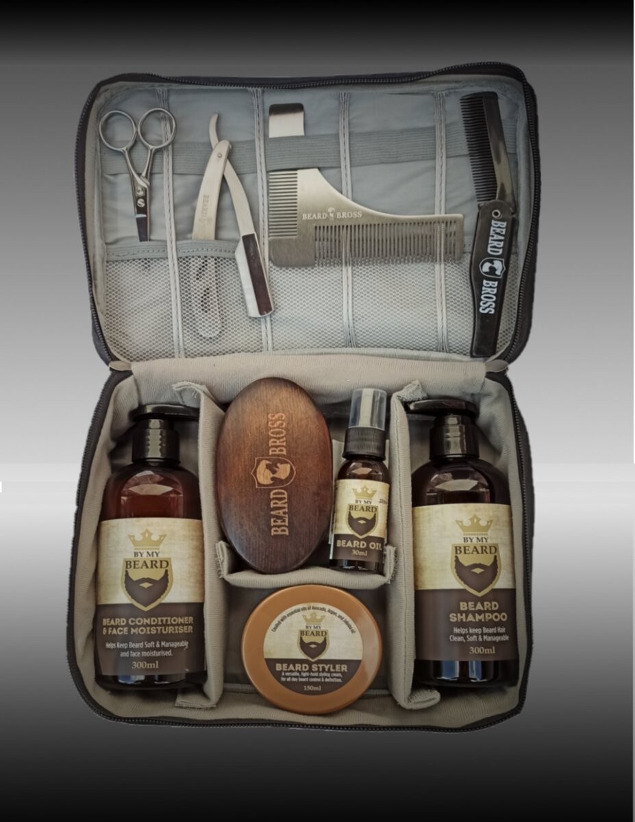 Набор для бороды Beard Bross с косметикой By My Beard, бритвой, шаблоном и ножницами упакован в элегантный черный футляр, складную расческу и вместительную черную косметичку.