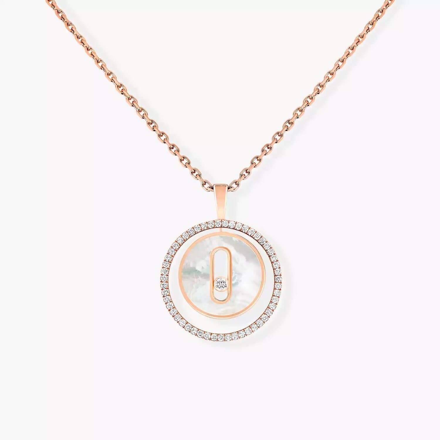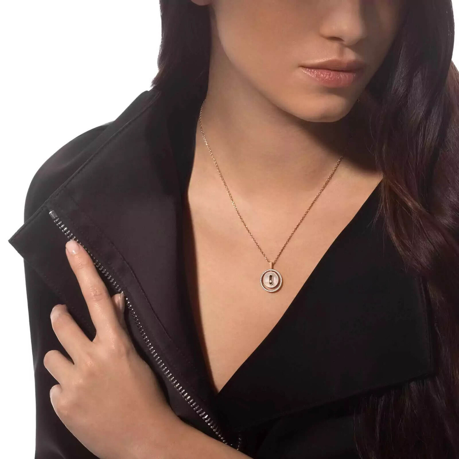 Будьте очарованы колье Lucky Move из розового золота с бриллиантами и белым перламутром. Коллекция украшений Lucky Move, вдохновленная ювелирными изделиями-талисманами, теперь дополнена декоративными камнями, которые придают изделию яркий оттенок, такой же уникальный, как и ваша индивидуальность. Белый перламутр, который естественным образом образуется в некоторых раковинах, завораживает своими тонкими радужными отблесками. В углублении в центре находится бриллиант, символизирующий свободу. Медальон поворачивается сам по себе и выделяется световым кругом, обрамленным мириадами бриллиантов. Сверкающие отблески, сияние и движение создают неподвластное времени роскошное ювелирное изделие.