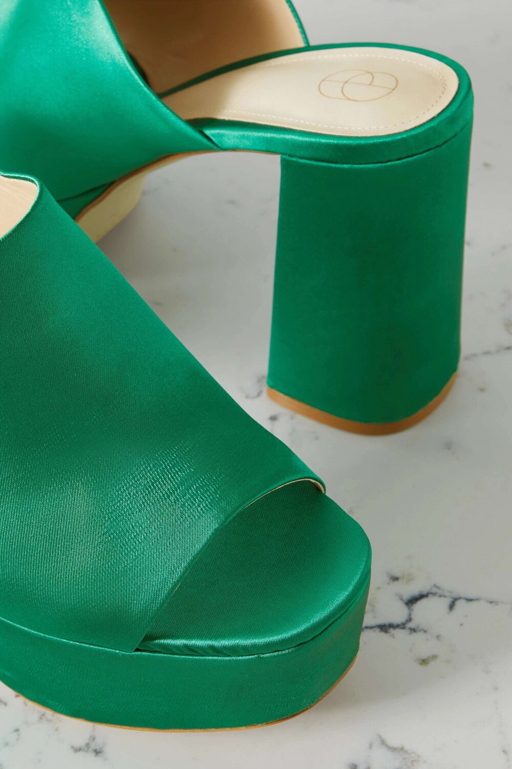 ЭКСКЛЮЗИВ В NET-A-PORTER. Туфли без задника от Porte & Paire добавят вашему образу серьезной высоты — они опираются на массивную подошву-платформу, уравновешенную высокими блочными каблуками. Они сделаны из блестящего атласа яркого нефритового оттенка. Носите его со всем: от расклешенных джинсов до летящих платьев.