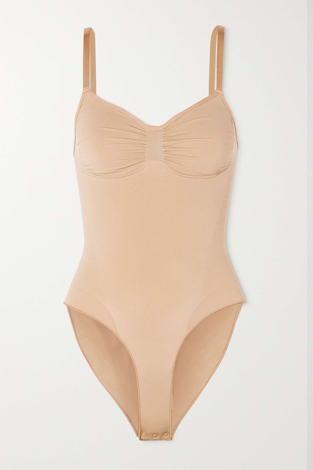 Ким Кардашьян часто носит это боди в своих кампаниях для SKIMS — неудивительно, потому что это универсальное корректирующее белье. Эта бесшовная модель приподнимает ягодицы, моделирует корпус и поддерживает бюст. Низкая спинка и высокие штанины делают его отличной основой для многих нарядов.