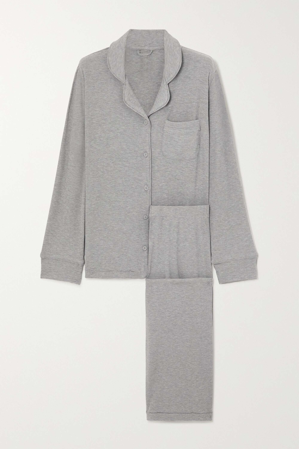 SKIMS славится невероятно мягкой одеждой для сна. Как и почти все пары из коллекций лейбла, этот комплект для сна никогда не захочется снимать. Модель из трикотажа стрейч-модала в рубчик с рубашкой свободного кроя на пуговицах и брюками с кулиской.