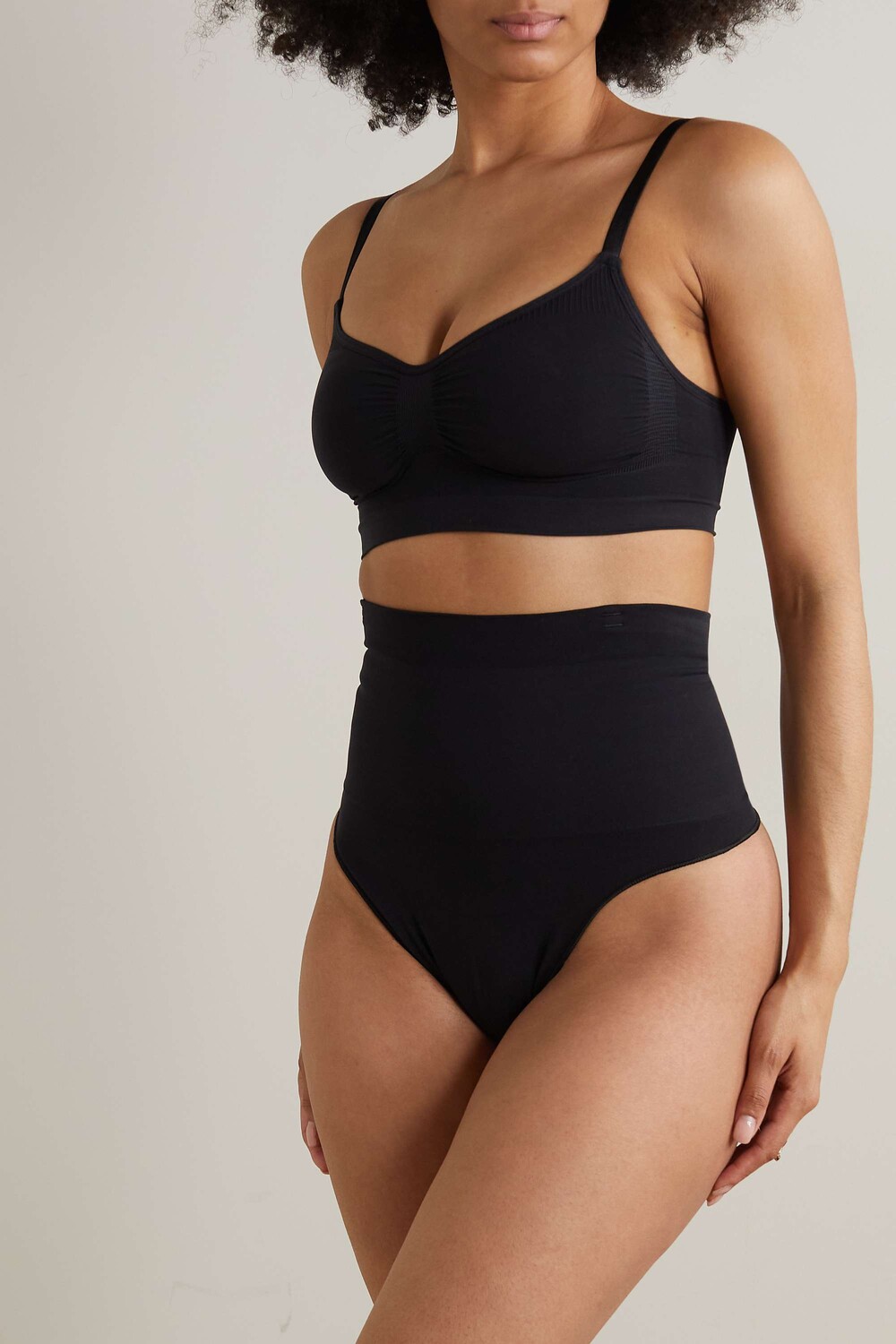 Ким Кардашьян впервые пришла в голову идея запустить линию корректирующего белья более десяти лет назад — это было вызвано тем фактом, что она всегда кроила, шила и окрашивала свои существующие решения. Эти стринги, созданные в результате специального тестирования и разработки ткани, являются частью линии «Core Control» и предназначены для того, чтобы оставаться незамеченными под одеждой. Команда лейбла говорит, что он «сглаживает и плотно очерчивает» ваш живот благодаря поддерживающей компрессионной посадке. Двойной пояс и силиконовая полоска сзади удерживают его на месте.
