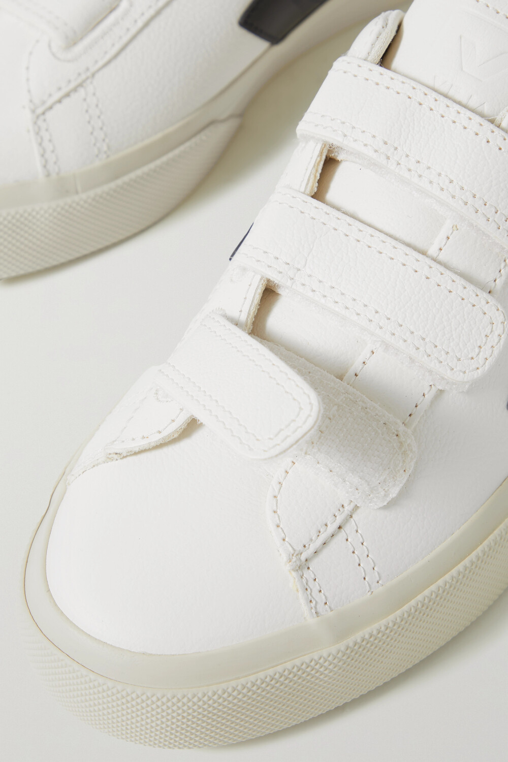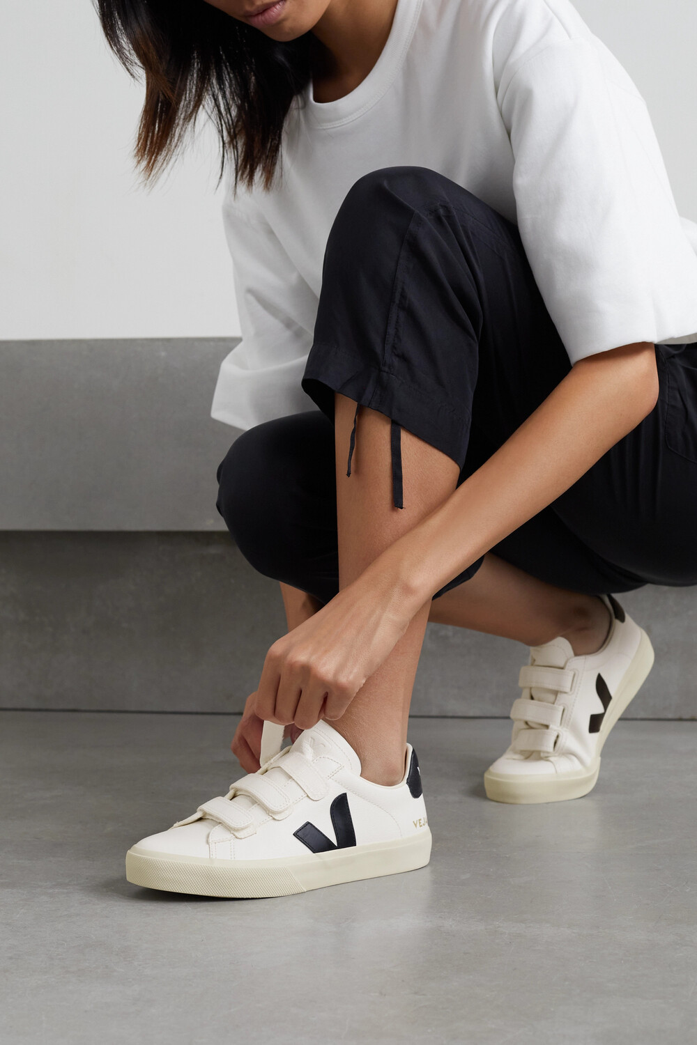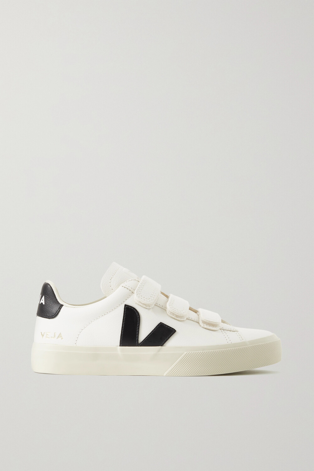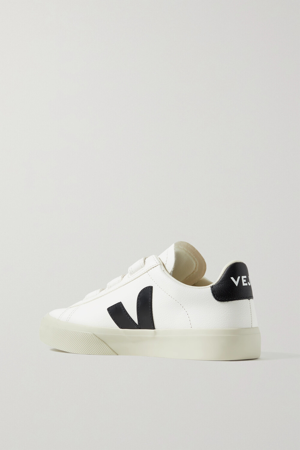 Кроссовки Veja 'Recife' подойдут для многих нарядов в любое время года благодаря универсальной бело-черной палитре. Изготовленные из не содержащей хрома кожи с резиновыми вставками, они имеют фирменную резиновую подошву и три ремешка с застежками-липучками.