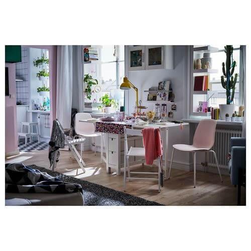 Стол НОРДЕН с откидными полами позволяет разместиться от 2-4 человек. Можно регулировать стол в соответствии с потребностями. В ящиках под столом можно хранить столовые приборы, столовые салфетки и свечи.