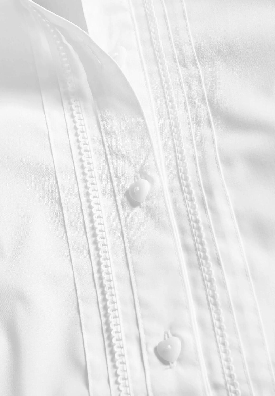 Блузка обычного прямого кроя с длинными рукавами, с круглым отложным воротником. Блузка и манжеты рукавов застегиваются на пуговицы. Спереди блузка украшена кружевной отделкой.
