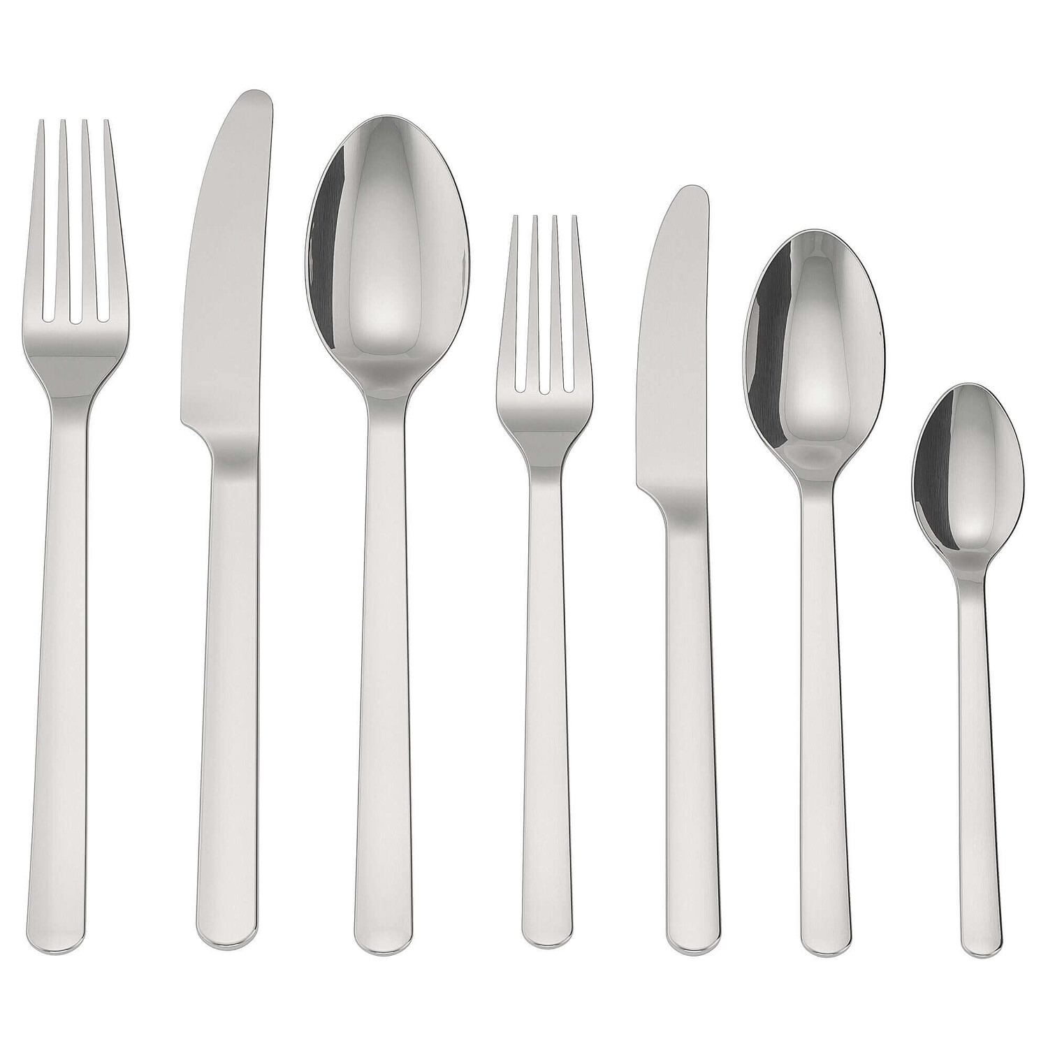 Вилка, нож, ложка, чайная ложка, десертная/салатная вилка, десертный/салатный нож и десертная/салатная ложка, каждого предмета по 8 штук.