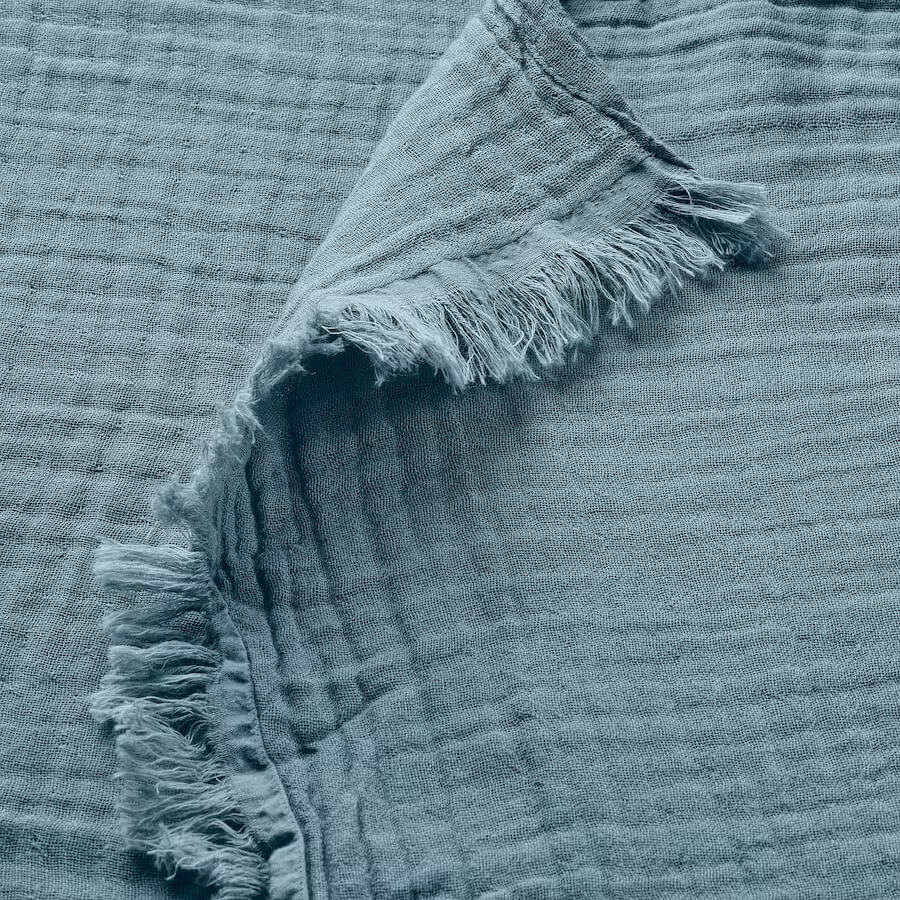 Сверхмягкое покрывало Vallkrassing серо-голубого цвета на диван или кровать создает непринужденную атмосферу. Многослойный хлопковый муслин имеет гофрированную поверхность, которая хорошо гармонирует с необработанными краями.