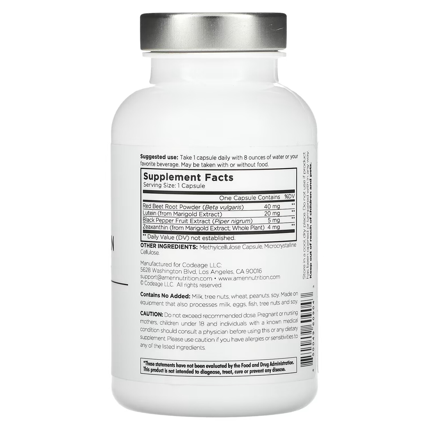 Расширенное питание. Пищевая добавка. Без ГМО. Без сои. Без молока. Без глютена. Капсулы с добавкой Amen Eyes содержат лютеин и зеаксантин из календулы, которые помогают поддерживать здоровое зрение. Эти антиоксиданты находятся в макуле, центре сетчатки, отвечающем за детальное зрение. Эта формула также содержит корень красной свеклы и черный перец для дальнейшего поддержания здоровья глаз и биодоступности питательных веществ.