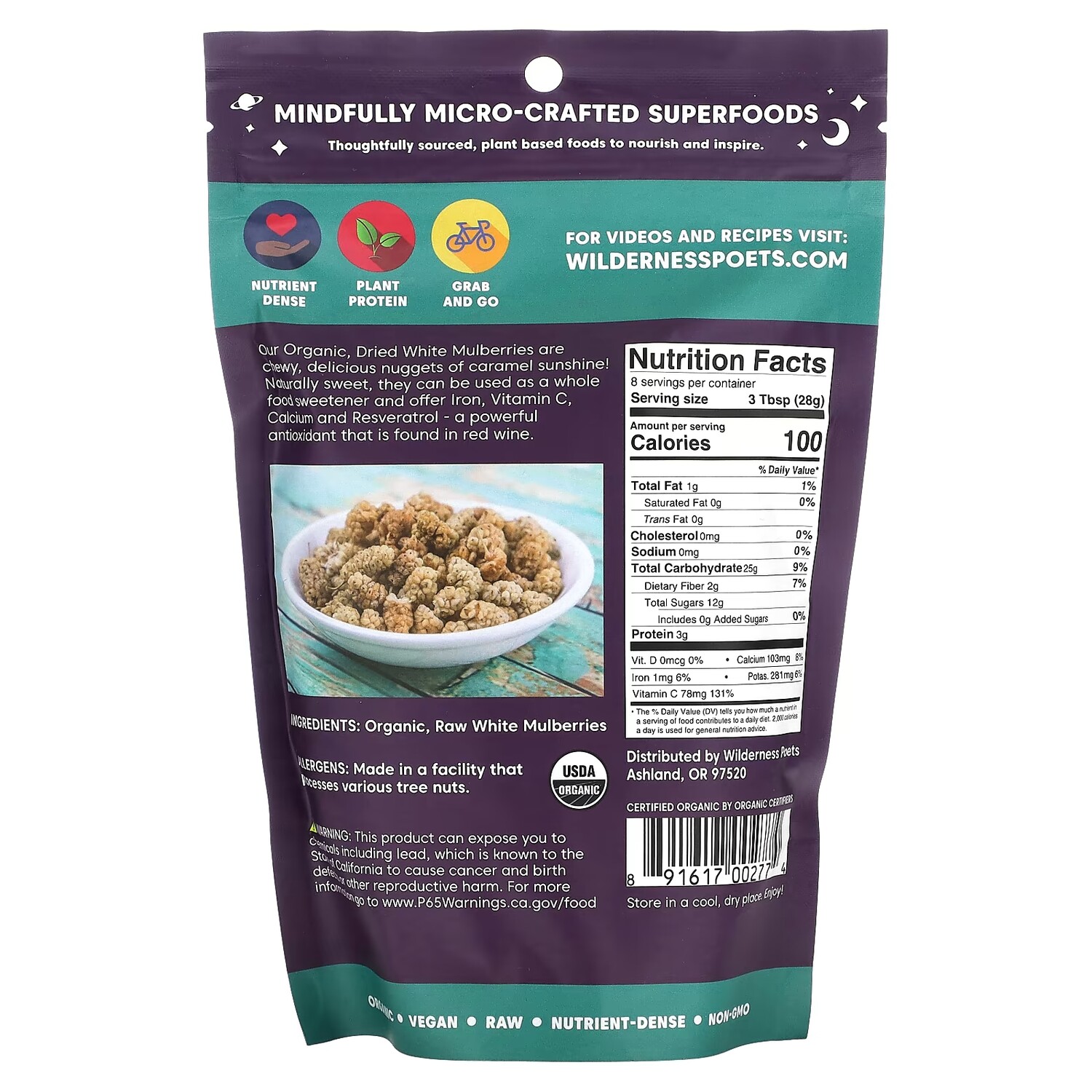 Не является лекарственным средством. Состав: органический, необработанная белая шелковица. Произведено на предприятии, которое обрабатывает древесные орехи разных видов. Хранить в сухом и прохладном месте. Этот продукт может подвергнуть вас воздействию химических веществ, в том числе свинца, которые, по данным штата Калифорния, могут стать причиной возникновения онкологических заболеваний и врожденных аномалий развития или причинить иной вред репродуктивной системе.