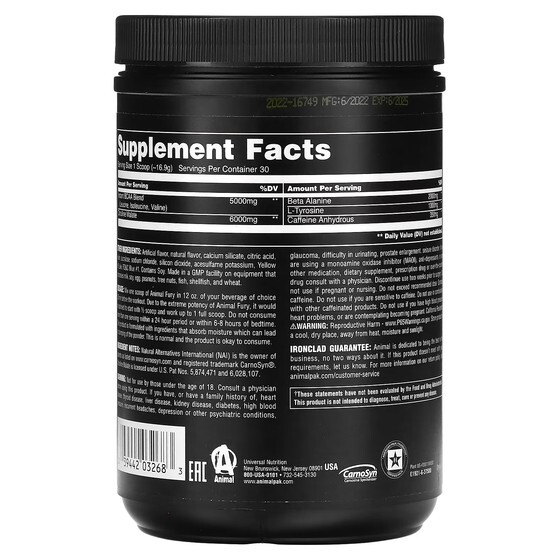 Пищевая добавка. Animal Fury предназначена для того, чтобы причинять боль. Концентрированная предтренировочная формула, наполненная эффективными дозами наиболее эффективных ингредиентов, Animal Fury заряжена всем, что требуется для самых тяжелых тренировок, и все это в одной мерной ложке. Когда пришло время взорвать тяжелое железо и оставить пол тренажерного зала в щебне, Звериная Ярость поджигает фитиль.