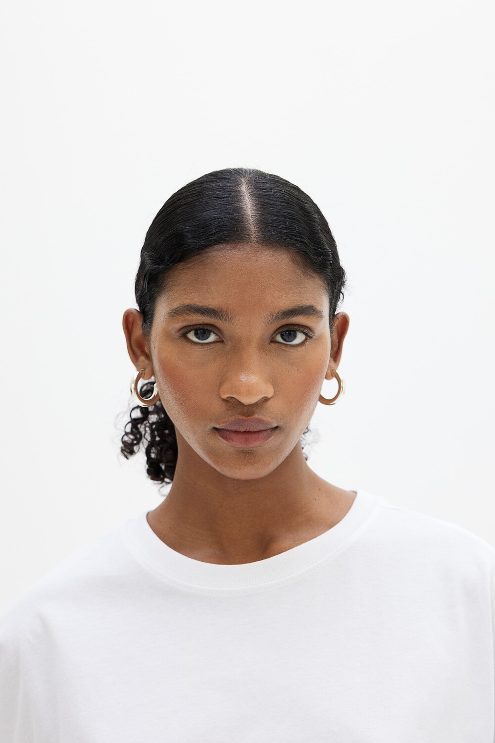 Футболка оверсайз из хлопкового трикотажа с круглым вырезом в рубчик, заниженной линией плеч и прямым краем.