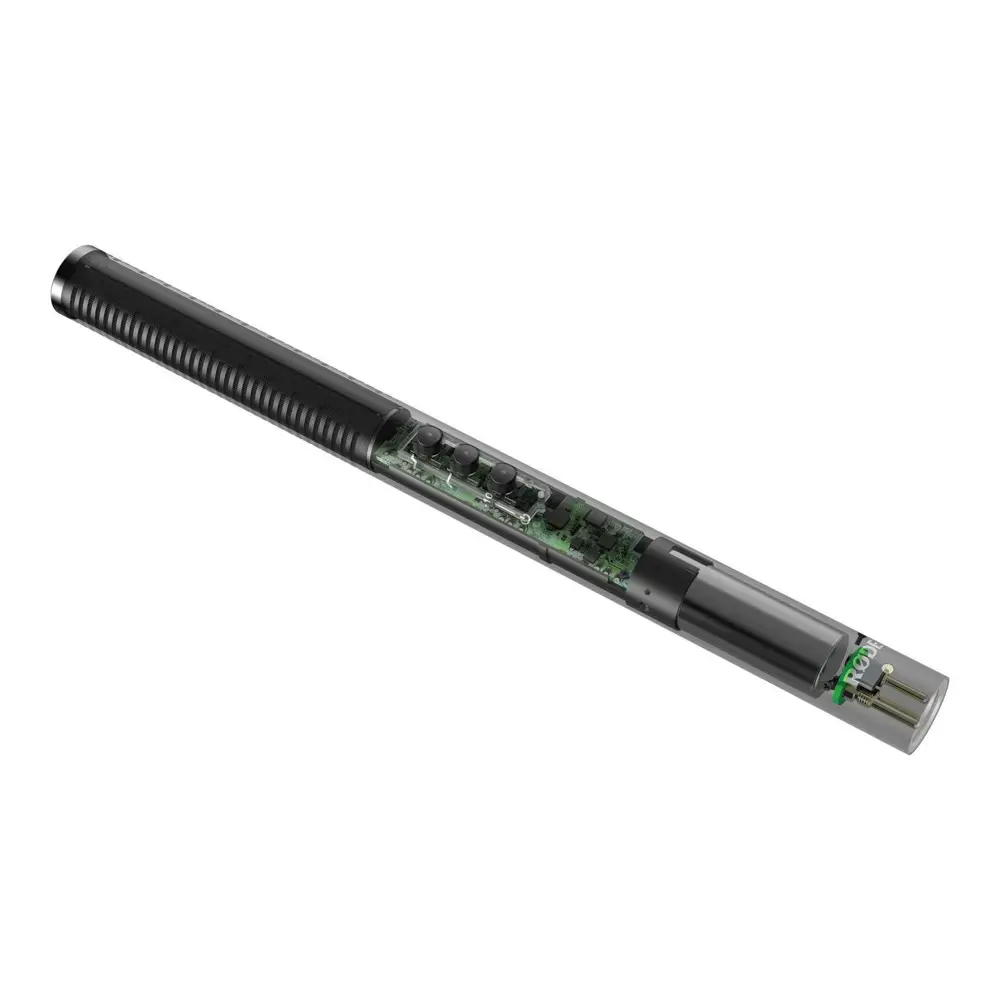 Разработанный на основе популярной модели NTG2, NTG-4+ оборудован новейшим конденсаторным капсюлем с низким уровнем шума и высокой чувствительностью, а также контролем эквализации/уровня прямо на корпусе микрофона. Встроенный Hi-Pass фильтр (частота среза 75 Hz), аттенюатор (-10 dB ) и усиление высоких частот управляются цифровыми кнопками, значения сохраняются при выключении микрофона. NTG-4+ оборудован встроенным аккумулятором, позволяющим микрофону работать до 150 часов без подзарядки. Зарядка производится через micro USB кабель - это означает возможность зарядить микрофон практически где угодно, даже в машине или от power-банка. Допустимо и классическое фантомное питание. Электронная схема микрофона обеспечивает чрезвычайно низкий уровень шумов и высокую чувствительность.