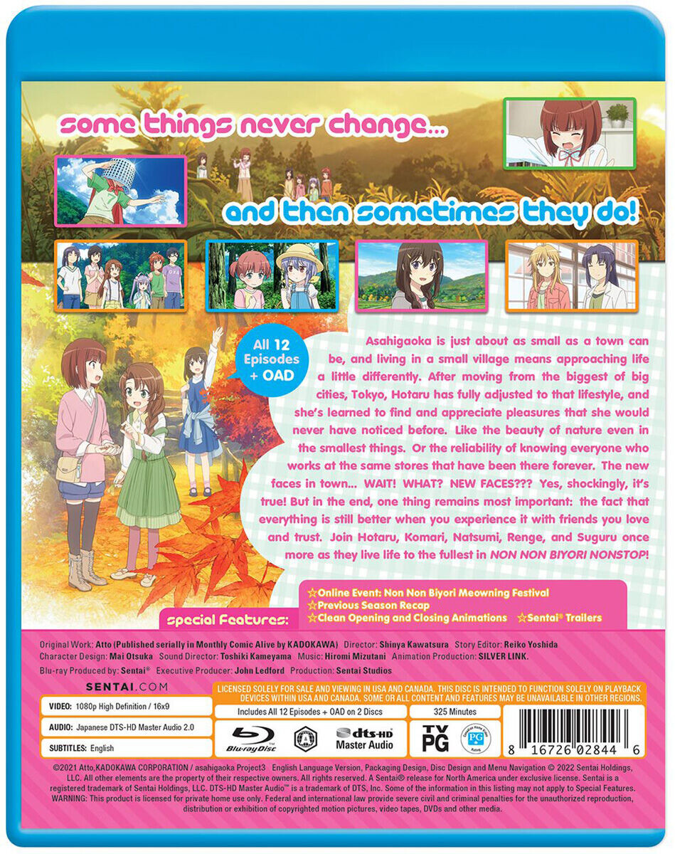 Non Non Biyori Nonstop содержит эпизоды 1-12 третьего сезона аниме, режиссером которого является Синья Кавацура, а также Our Club Worked Hard OAD.