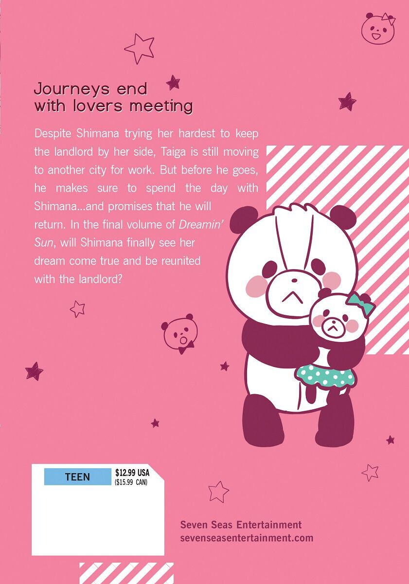 Несмотря на то, что Шимана изо всех сил старается удержать хозяина дома рядом с собой, Тайга все равно переезжает в другой город по работе. Но перед тем как уйти, он обязательно проводит день с Шиманой... и обещает, что вернется. Сможет ли Шимана наконец увидеть, как ее мечта сбудется, и воссоединиться с хозяином дома в последнем томе Dreamin' Sun?