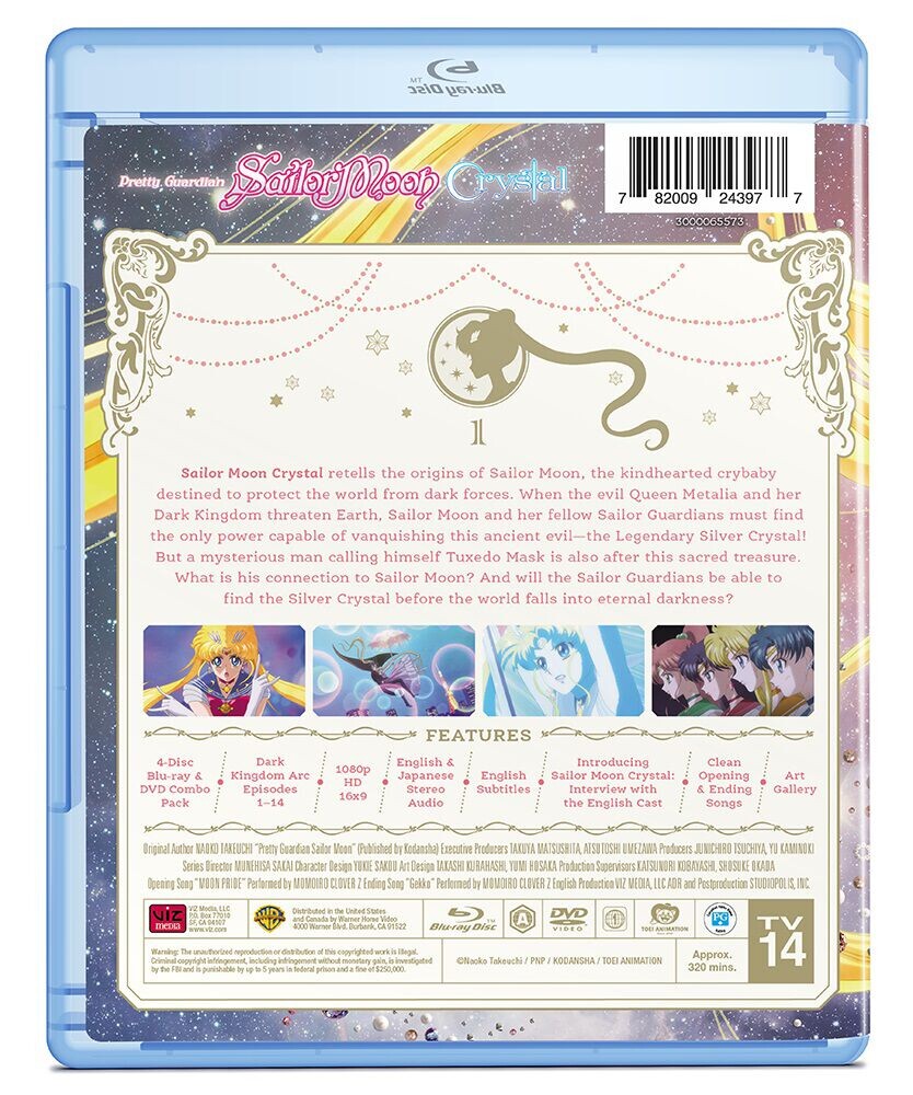 Sailor Moon Crystal Set 1 содержит эпизоды 1-14 аниме режиссера Мунехисы Сакаи, а также дополнительные материалы на 2 дисках Blu-ray и 2 DVD, картонную коробку Deluxe, полноцветный буклет, семь полноцветных художественных карточек.