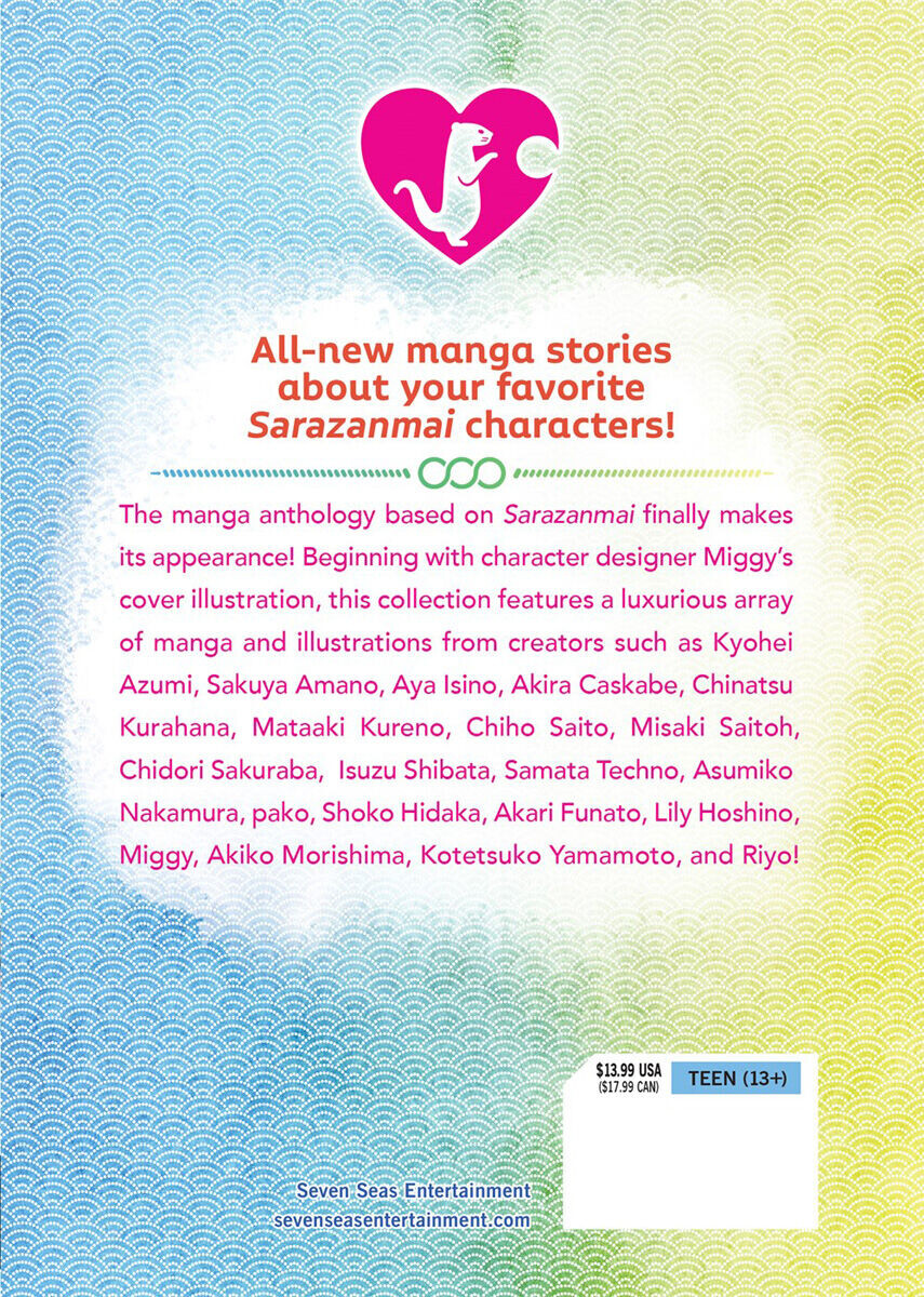 Антология манги, основанная на Sarazanmai, наконец-то вышла! Начиная с иллюстрации на обложке дизайнера персонажей Мигги, эта коллекция включает в себя роскошный набор манги и иллюстраций от таких создателей, как Кёхэй Адзуми, Сакуя Амано, Ая Исино, Акира Каскабе, Тинацу Курахана, Матааки Курено, Чихо Сайто, Мисаки Сайто, Чидори Сакураба, Исузу Сибата, Самата Техно, Асумико Накамура, Пако, Шоко Хидака, Акари Фунато, Лили Хосино, Мигги, Акико Моришима, Котецуко Ямамото и Риё!