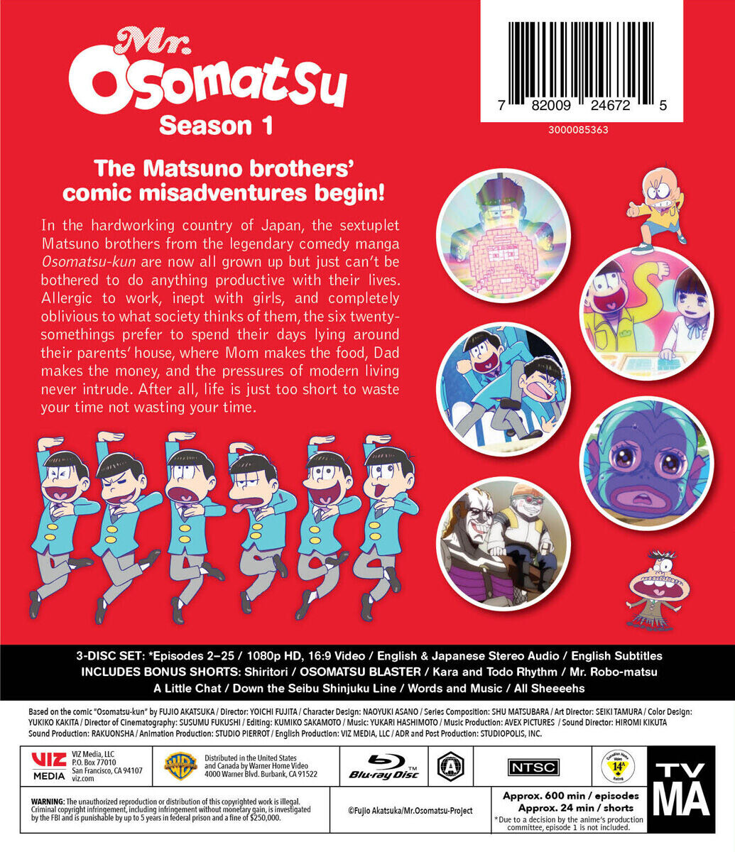 Первый сезон «Мистера Осомацу» содержит эпизоды 2–25 аниме, снятого Ёити Фудзитой. Спорный первый эпизод не включен.