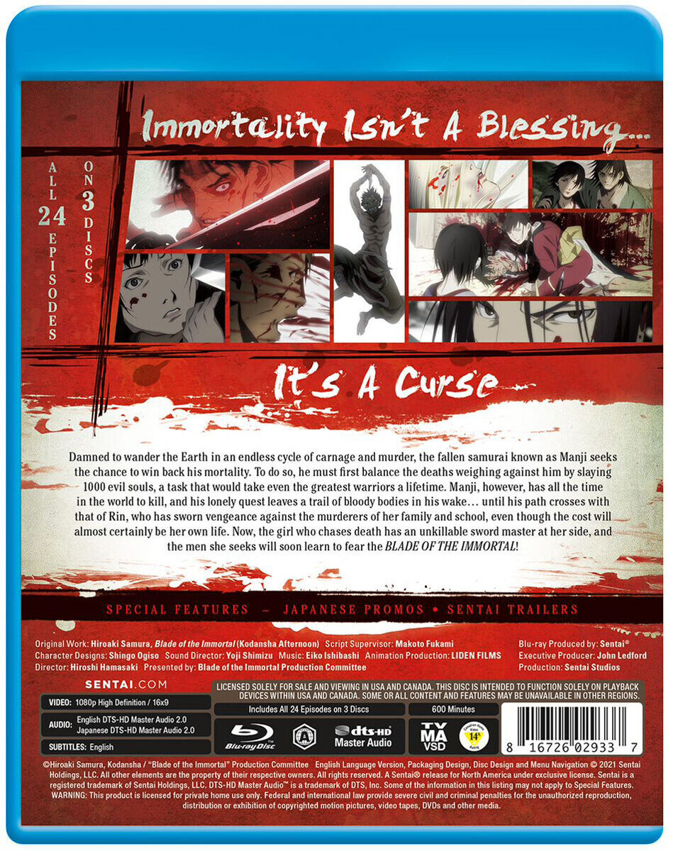Blade of the Immortal содержит эпизоды 1-24 аниме-адаптации 2019 года, снятой Хироси Хамасаки.