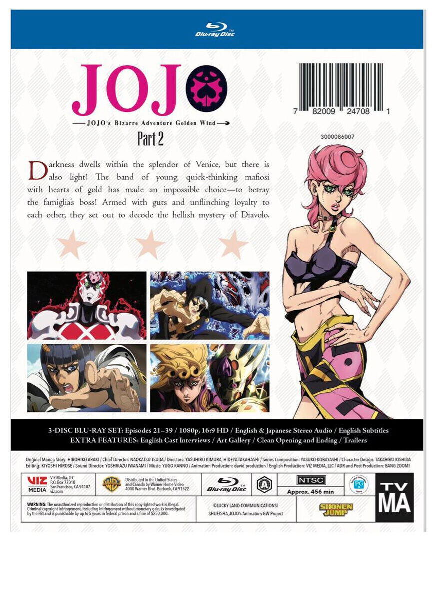 JoJo's Bizarre Adventure: Golden Wind Set 2 включает эпизоды 21-39 аниме, снятого Наокацу Цудой.