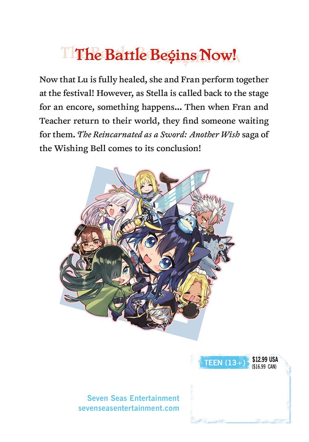 Теперь, когда Лу полностью исцелилась, она и Фрэн выступают вместе на фестивале! Однако, когда Стеллу вызывают на сцену для выхода на бис, что-то происходит... Затем, когда Фрэн и Учитель возвращаются в свой мир, они обнаруживают, что кто-то их ждет. The Reincarnated as a Sword: Another Wish сага о Колоколе желаний подходит к своему завершению!
