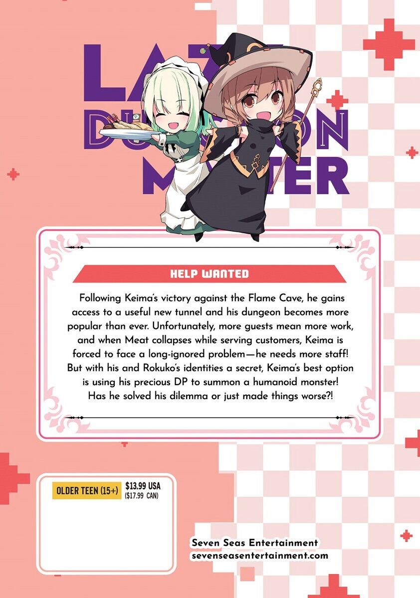 После победы Кеймы над Пещерой Пламени он получает доступ к новому полезному туннелю, и его подземелье становится популярнее, чем когда-либо. К сожалению, больше гостей — больше работы, и когда Мясо падает, обслуживая клиентов, Кейме приходится столкнуться с давно игнорируемой проблемой — ему нужно больше персонала! Но поскольку его личности и личности Рокуко остаются в тайне, лучшим вариантом для Кеймы является использование его драгоценного DP для вызова гуманоидного монстра! Решил ли он свою дилемму или только усугубил ситуацию?!