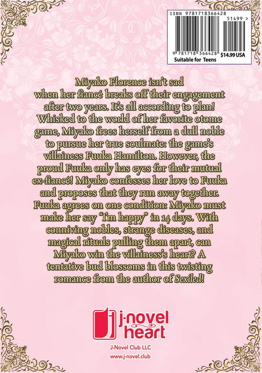 Мияко признается Фууке в любви и предлагает сбежать вместе. Фуука соглашается при одном условии: Мияко должна заставить ее сказать «Я счастлива» за 14 дней. Сможет ли Мияко завоевать сердце злодейки, несмотря на коварных дворян, странные болезни и магические ритуалы, которые их разлучают? В этом запутанном романе от автора Sexiled расцветает слабый бутон!