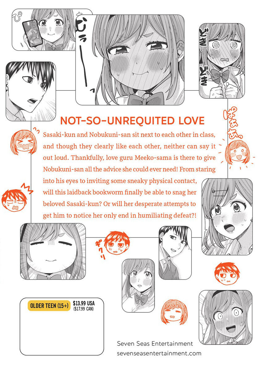Сасаки-кун и Нобукуни-сан сидят рядом друг с другом в классе, и хотя они явно нравятся друг другу, никто из них не может сказать этого вслух. К счастью, гуру любви Мико-сама здесь, чтобы дать Нобукуни-сан все советы, которые ей когда-либо понадобятся. От пристального взгляда в его глаза до приглашения на какой-нибудь скрытный физический контакт, сможет ли этот непринужденный книжный червь наконец заполучить своего любимого Сасаки-куна? Или ее отчаянные попытки заставить его заметить ее закончатся только унизительным поражением?!