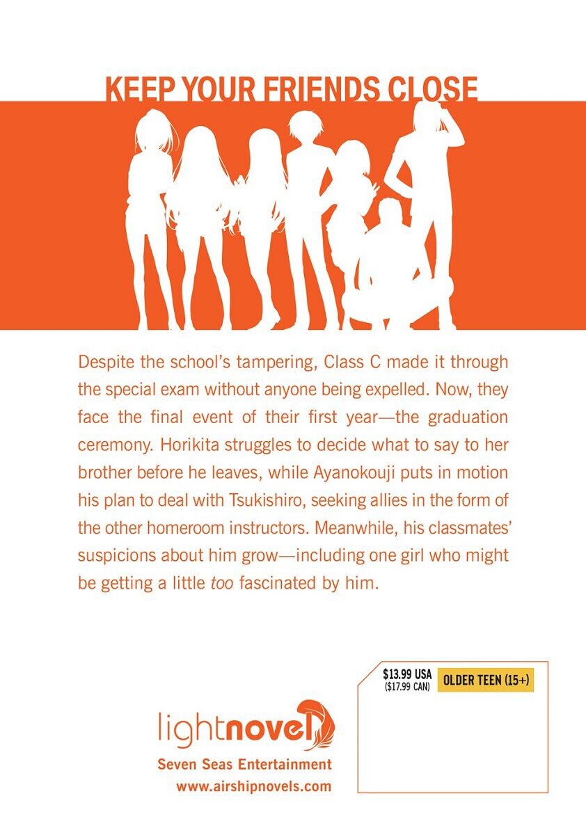 Несмотря на вмешательство школы, класс C сдал специальный экзамен, и никто не был исключен. Теперь им предстоит последнее событие первого года — выпускная церемония. Хорикита изо всех сил пытается решить, что сказать своему брату перед его уходом, в то время как Аянокоджи приводит в действие свой план по борьбе с Цукисиро, ища союзников в лице других классных руководителей. Тем временем подозрения его одноклассников по отношению к нему растут, включая одну девочку, которая, возможно, слишком им увлекается.