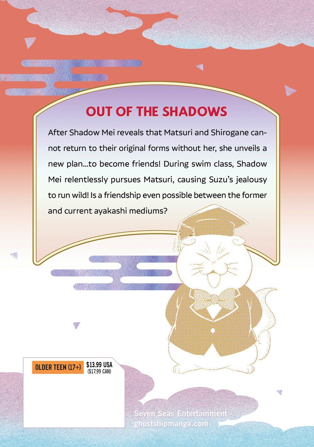 После того, как Тень Мэй раскрывает, что Мацури и Широгане не могут вернуться к своим первоначальным формам без нее, она раскрывает новый план... стать друзьями! Во время занятий по плаванию Тень Мэй неустанно преследует Мацури, вызывая у Сузу дикую ревность! Возможна ли вообще дружба между бывшим и нынешним медиумами аякаши?