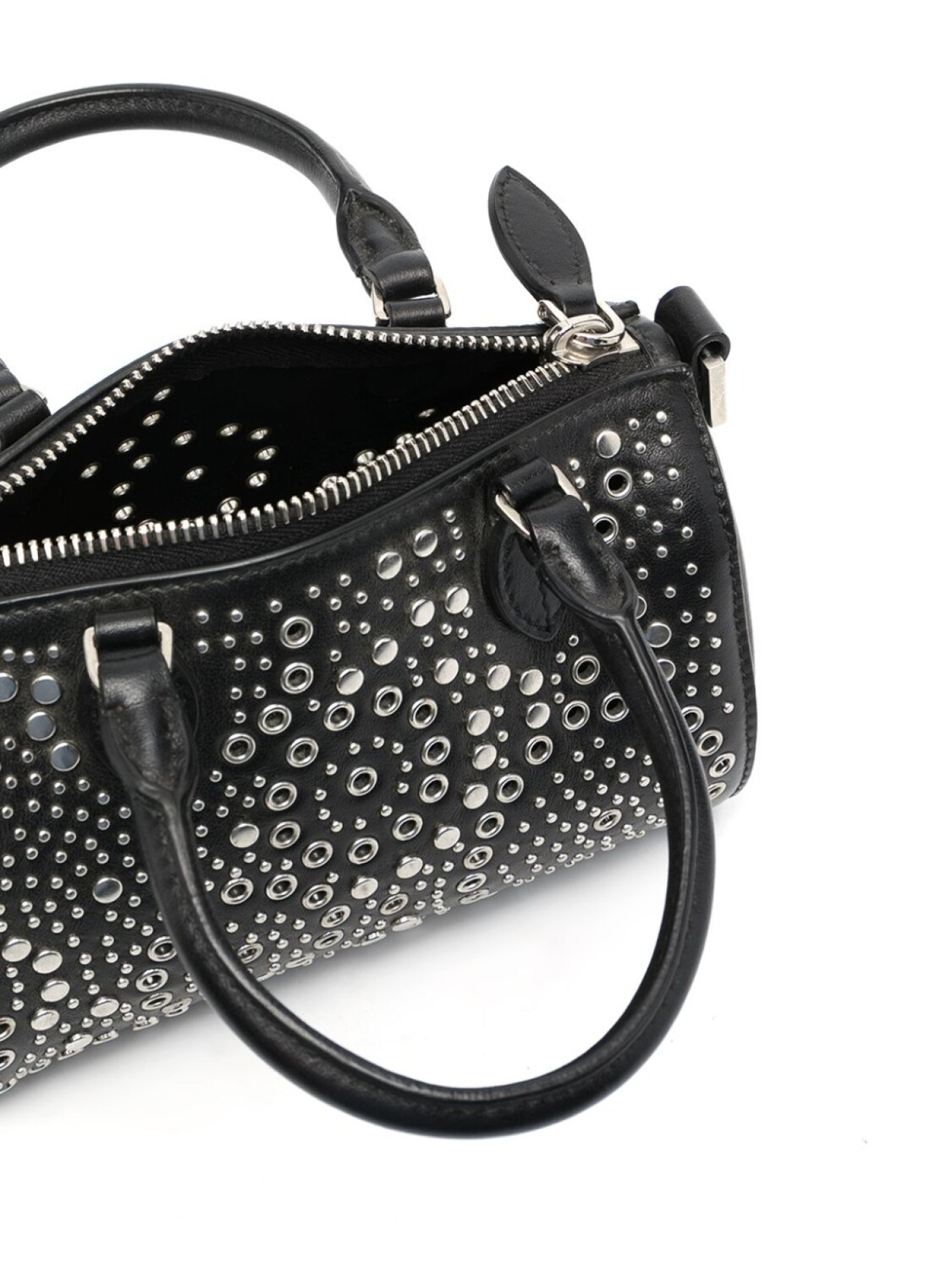 Серебристые заклепки, люверсы, две закругленные ручки, застежка на молнии сверху и основное отделение. Цвет: черный.