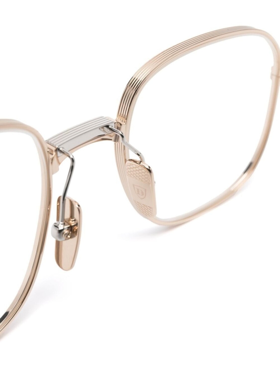 Золотистый, титан, квадратная оправа, прозрачные линзы, носоупоры, прямые дужки и дужки с закругленными концами. Обратите внимание, что на FARFETCH продаются оправы с линзами без диоптрий. В комплект входит защитный чехол для очков.