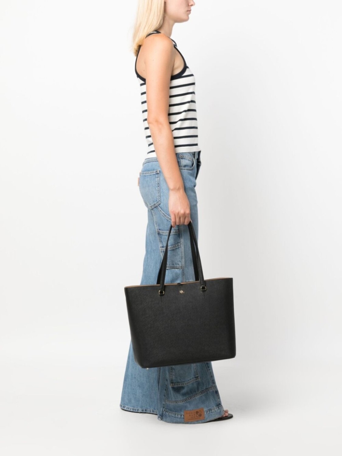 Золотистый металлический логотип, две длинные верхние ручки и внутренний прорезной карман.