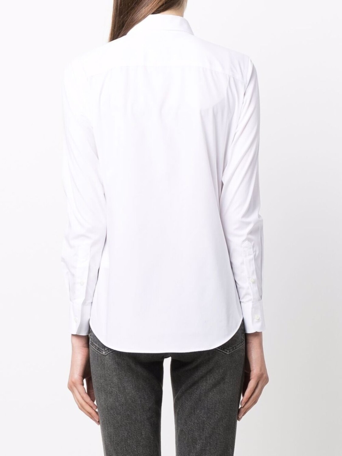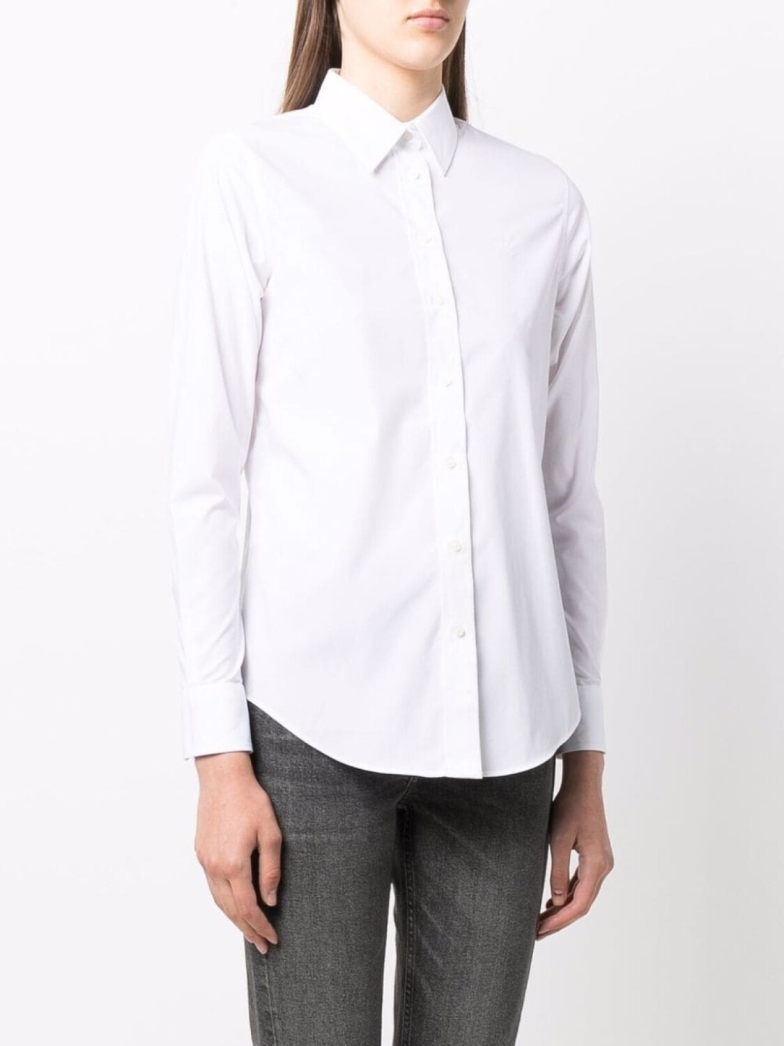 Эластичная модель, узкий крой, вышитый логотип на груди, классический воротник, застежка на пуговицах спереди, длинные рукава и закругленный подол. Цвет: белый.