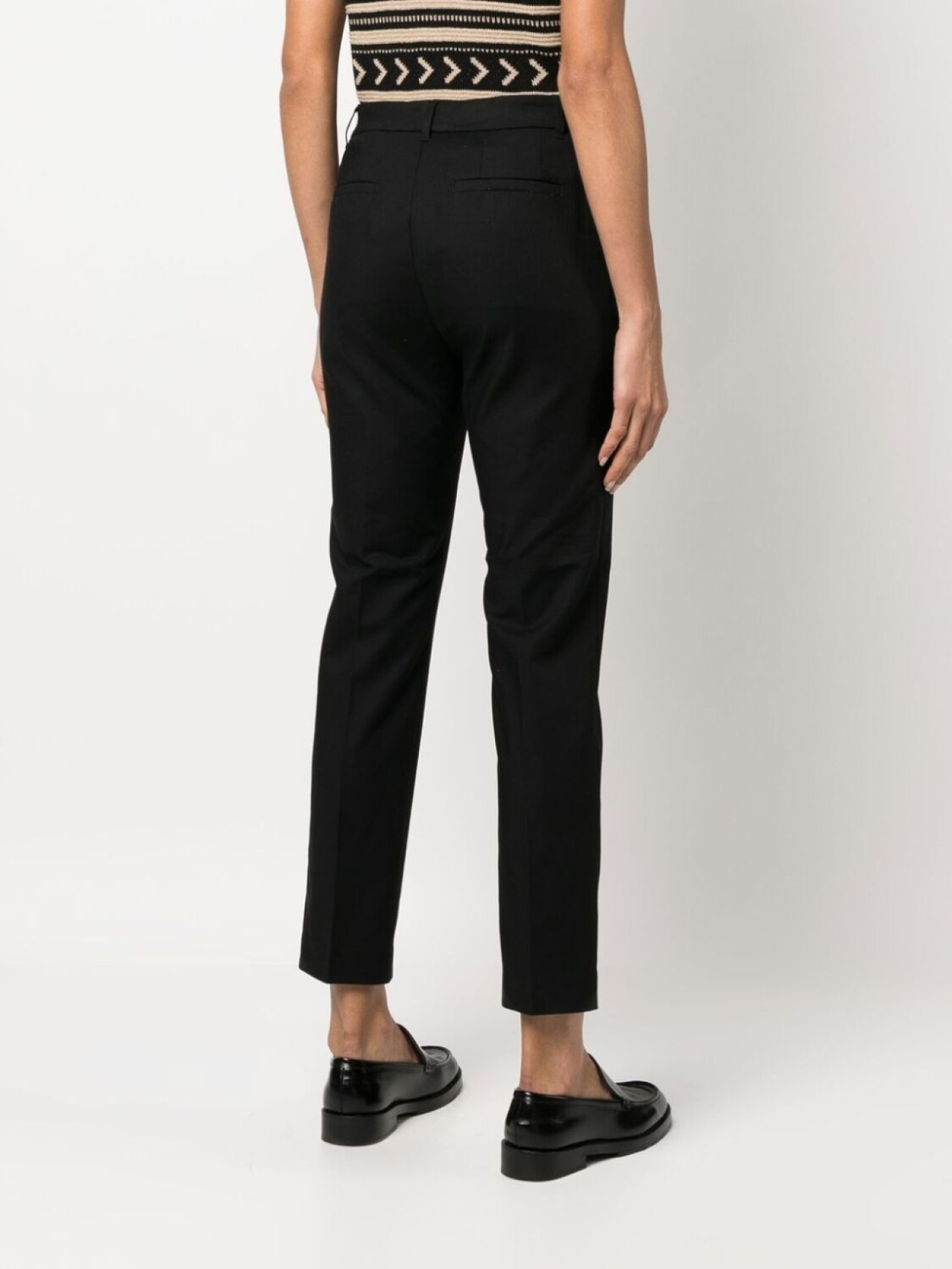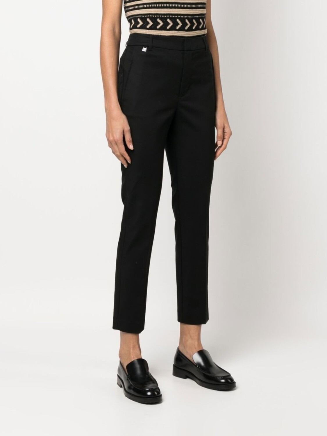 Черный, эластичный хлопок, серебристый металлический логотип, петли для ремня, строгий крой, укороченная длина, застежка на молнию и крючок, два кармана по бокам и два кармана с листочкой сзади.