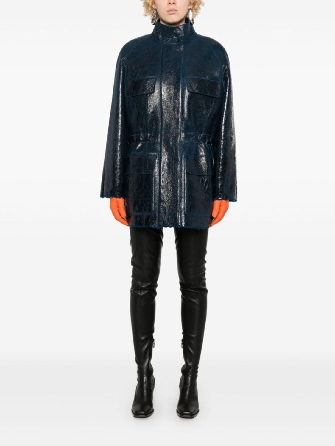 Темно-синий, овечья кожа, металл с покрытием, жатый эффект, застежка на кнопки и молнию спереди, воротник-стойка, длинные рукава реглан, два нагрудных кармана с клапанами, имитация кармана, кулиска на талии, подкладка из овечьей шерсти, прямой подол, длина выше колена