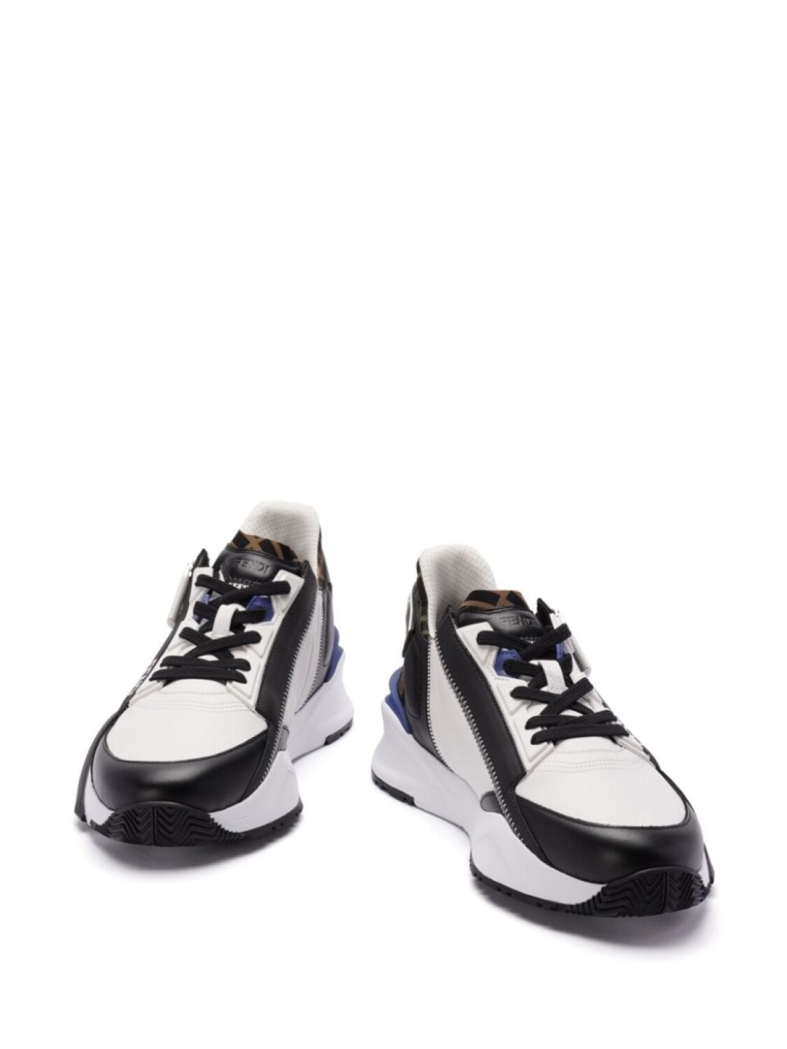 Белая/черная/королевская синяя телячья кожа со вставками, круглый носок с мотивом FF, нашивка с логотипом на язычке, язычок для подтягивания на пятке, мягкая подкладка на щиколотке, фирменная стелька, логотип на подошве, резиновая подошва, застежка-молния сбоку, шнуровка спереди