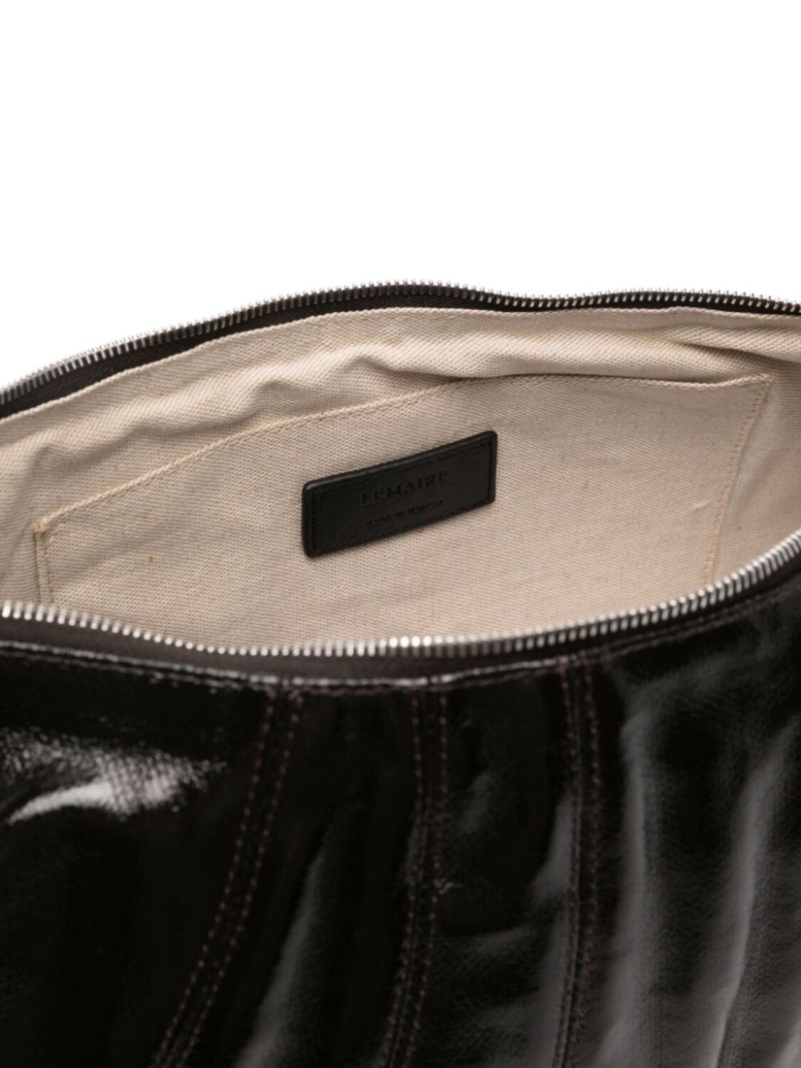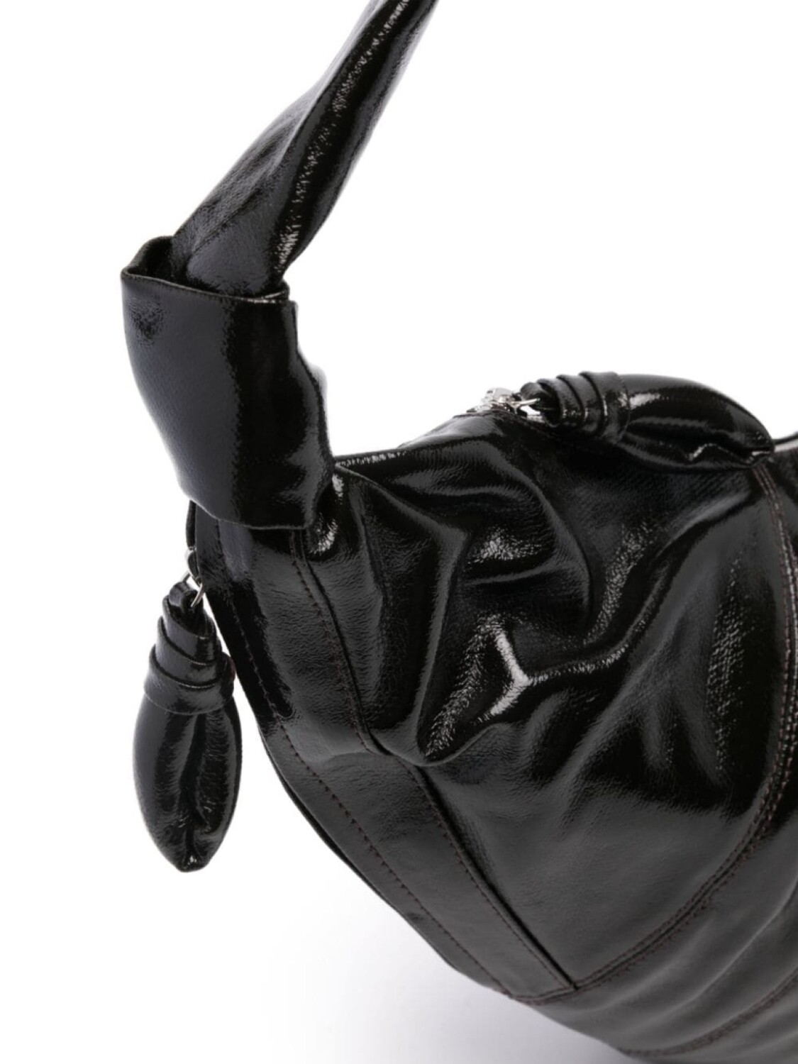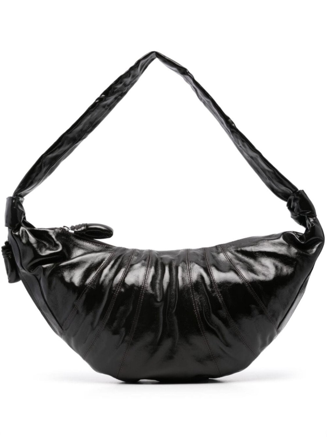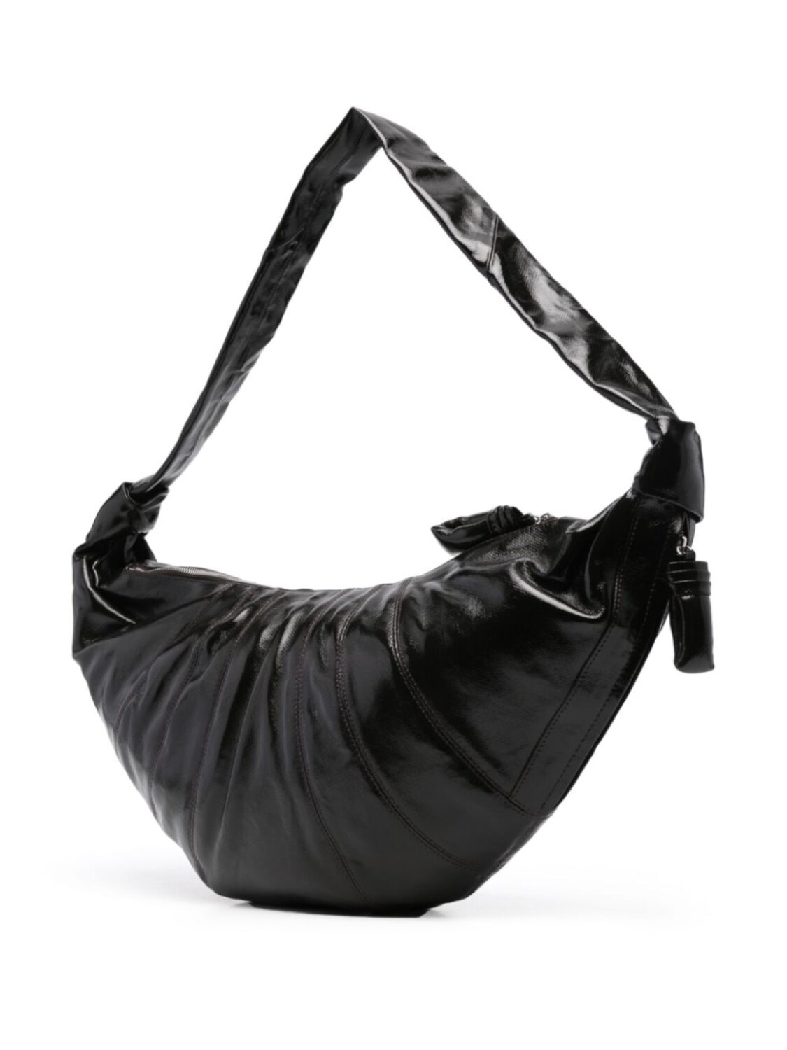 Черный, хлопок, металл с покрытием, глянцевая фактура, декор в виде узла, форма в виде круассана, застежка на молнии сверху, ремень на плечо, основное отделение, внутренняя вставка с логотипом, внутренний накладной карман, съемный карман-мешочек, подкладка из хлопка, серебристая фурнитура, На вещи могут быть складки и потертости — это не следы использования, а особенности техники обработки, которую используют Lemaire, чтобы подчеркнуть естественную текстуру кожи.