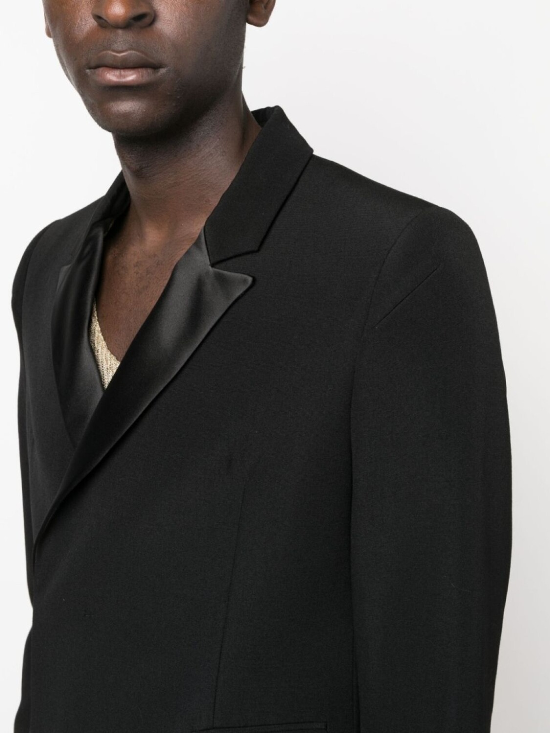Черный, шерсть, хлопок, заостренные лацканы, двубортная застежка на кнопки, два передних кармана с клапанами, длинные рукава, манжеты на пуговицах, шлица по центру сзади, прямой подол и длина миди.