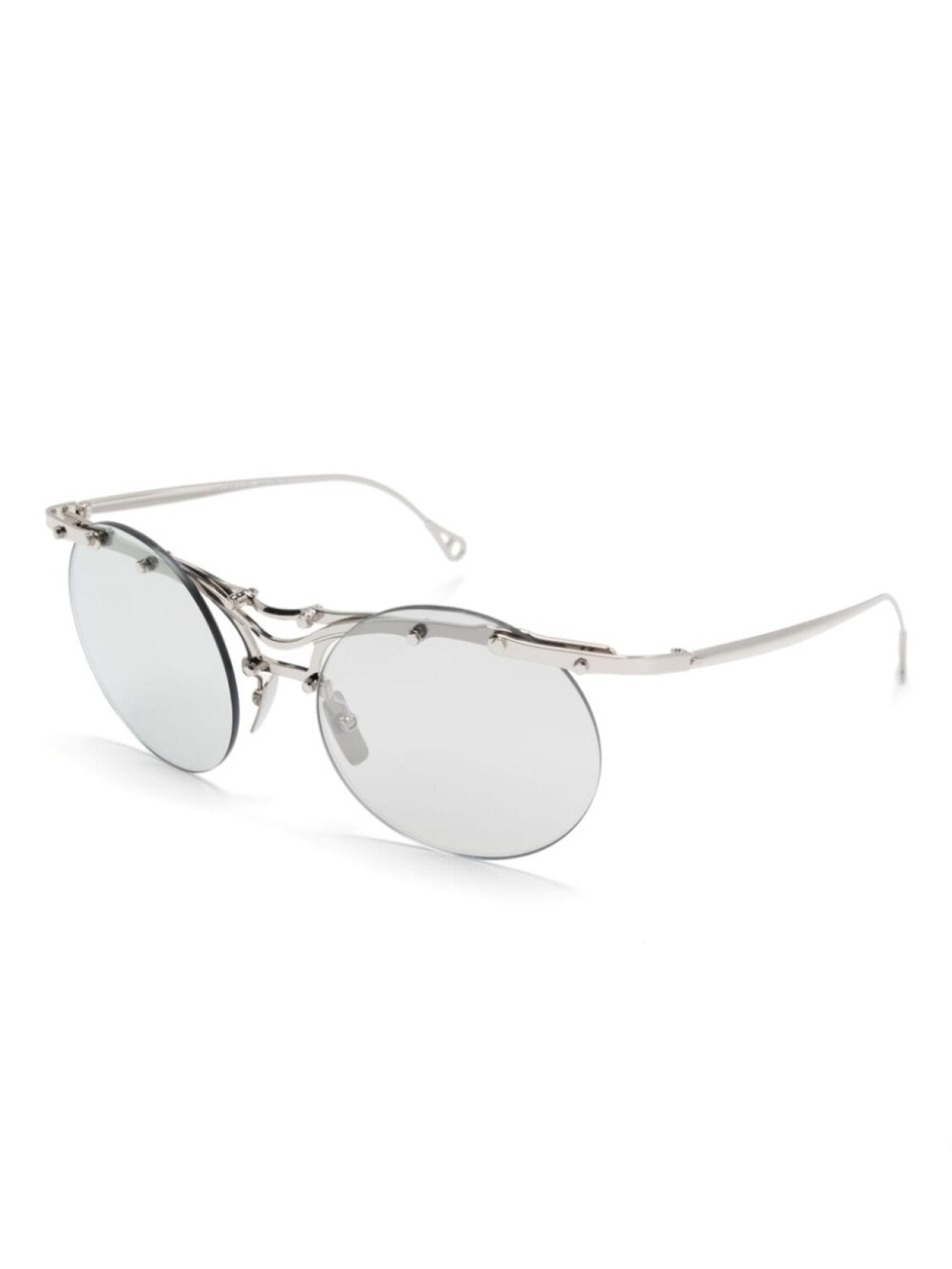 Серебристый, металлическая оправа, глянцевая фактура, заклепки, затемненные линзы, носоупоры, линзы без оправы, прямые дужки, дужки с закругленными концами, В комплект входит защитный чехол для очков.